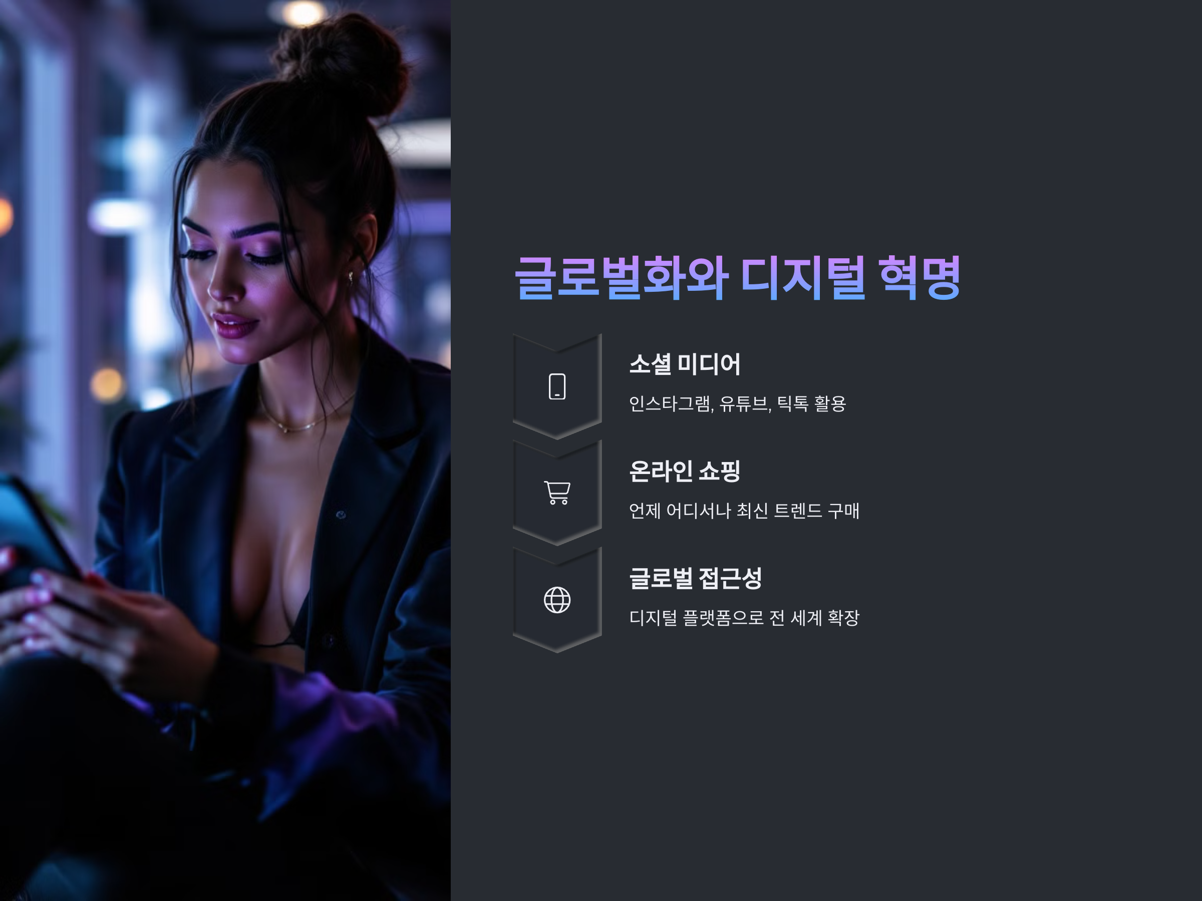 온라인 쇼핑의 보편화로 인해 소비자들은 언제 어디서나 최신 패션 트렌드를 확인하고 구매할 수 있게 되었습니다. 이에 따라 브랜드들은 디지털 플랫폼을 적극적으로 활용하여 전 세계 어디서나 접근할 수 있도록 하였고, 이는 글로벌화에 중요한 역할을 했습니다.