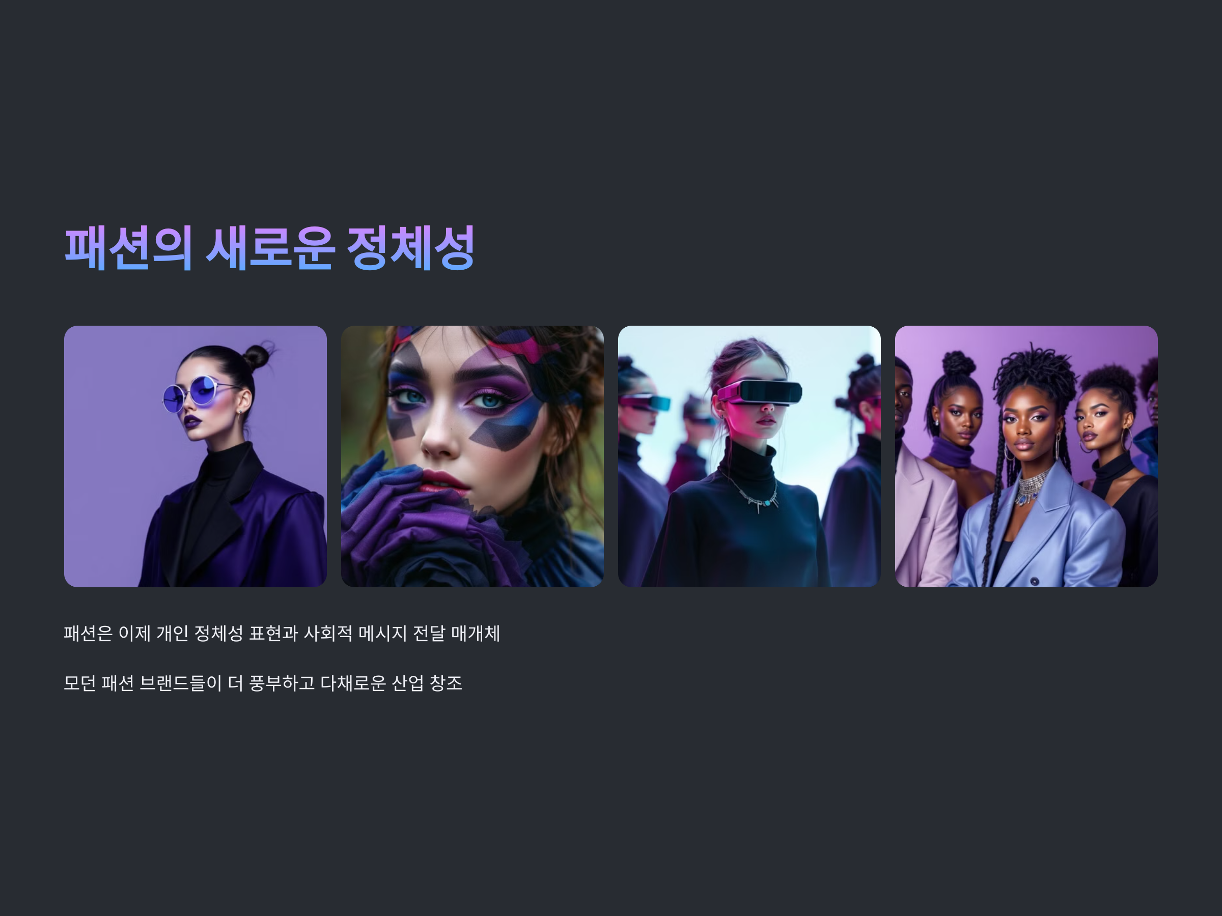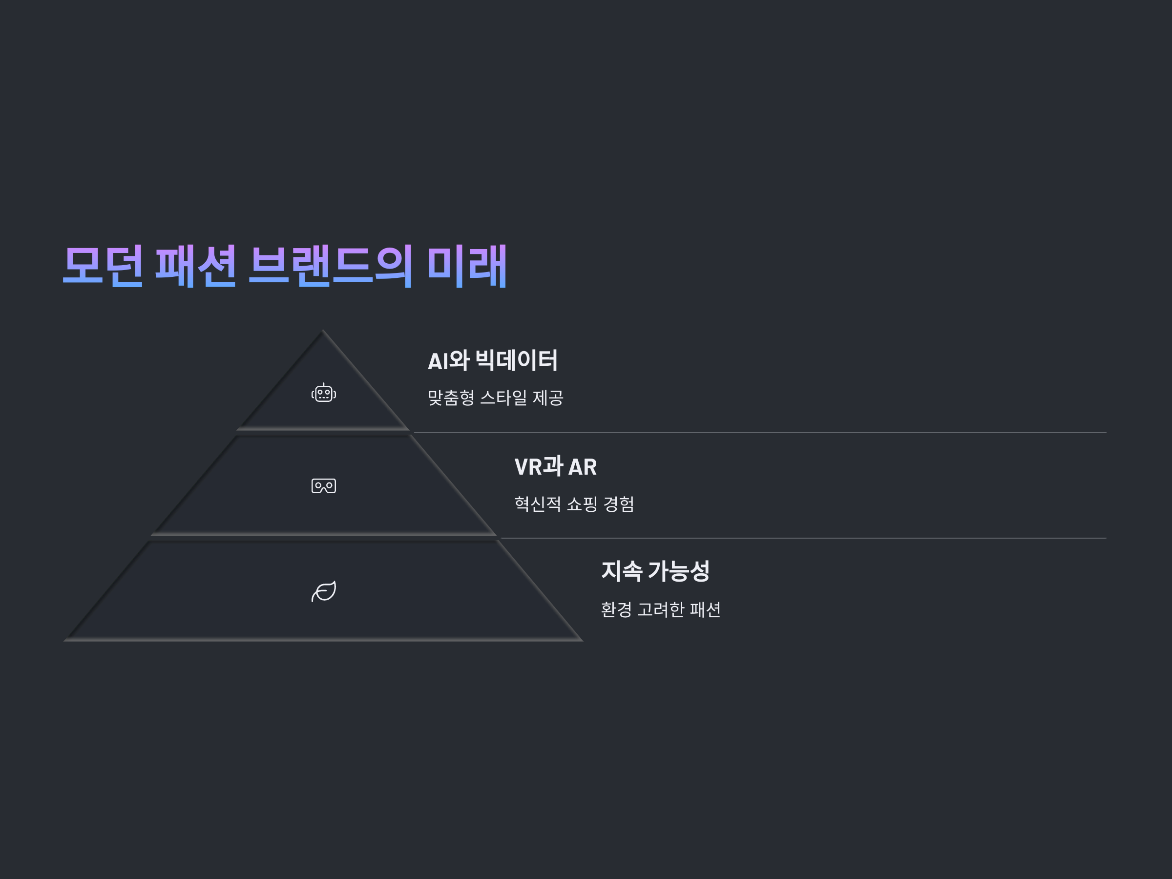 패션의 미래는 더욱 디지털화되고, 개인화되는 방향으로 나아가고 있습니다. AI와 빅데이터는 소비자들의 취향을 분석하고, 맞춤형 스타일을 제공하는 데 중요한 역할을 하고 있습니다. 또한, 가상 현실(VR)과 증강 현실(AR)은 온라인 쇼핑을 한층 더 혁신적인 경험으로 변모시키고 있습니다. 이러한 변화는 모던 패션 브랜드들에게 새로운 기회와 도전을 제공하고 있습니다.