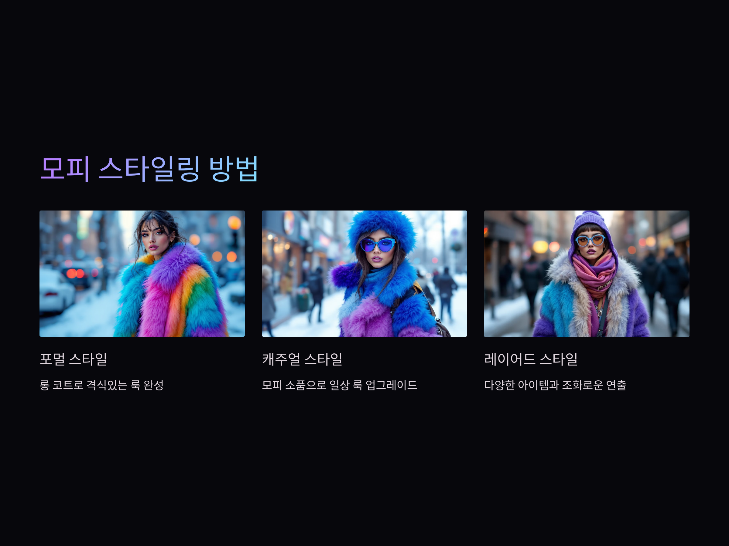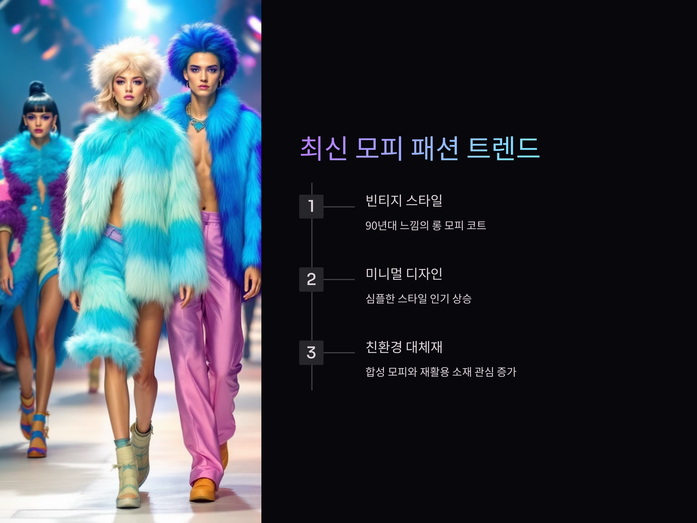 모피 패션은 매년 변화하는 트렌드에 따라 스타일도 달라집니다. 2025년 겨울에는 빈티지한 느낌의 모피 아이템이 유행할 것으로 예상됩니다. 예를 들어, 90년대 스타일의 롱 모피 코트나 체크 무늬가 들어간 모피 장갑이 유행할 가능성이 큽니다. 또한, 모피 아이템의 디자인이 점차 미니멀한 스타일로 변화하면서, 심플한 디자인의 모피 제품이 더욱 인기를 끌고 있습니다.