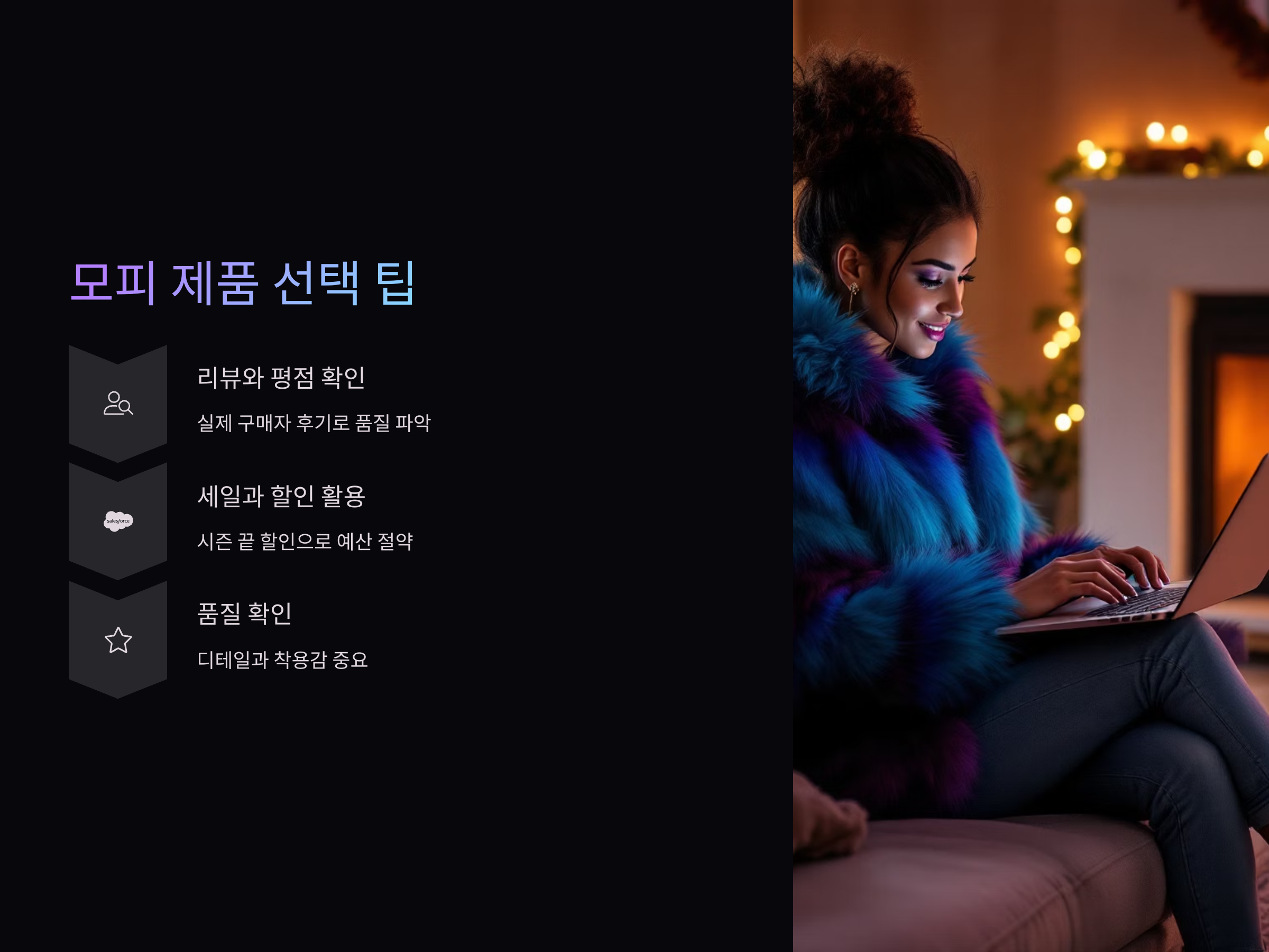 모피패션 쇼핑몰에서 쇼핑을 할 때는 품질, 가격, 브랜드 등을 잘 비교하면서 선택하는 것이 중요합니다. 제품을 구매하기 전에, 자신에게 적합한 스타일과 디자인을 고려한 뒤, 리뷰나 상품 설명을 통해 제품의 질감을 확인하는 것도 좋은 방법입니다. 또한, 할인 기간을 이용하거나, 믿을 수 있는 쇼핑몰에서 구매함으로써 가성비를 높일 수 있습니다. 마지막으로, 모피 패션을 통해 올 겨울도 따뜻하고 고급스러운 스타일을 완성해보세요!