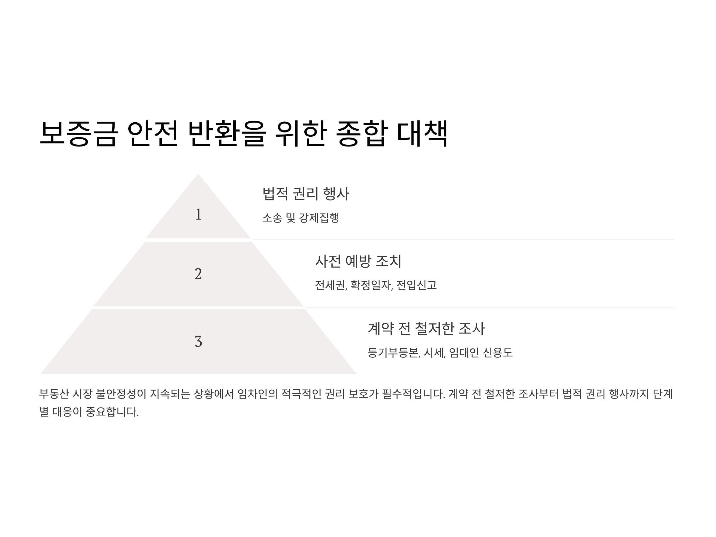 임차인이 보증금을 지키기 위해 반드시 취해야 할 법적 보호조치가 있습니다. 첫째, 계약서에 확정일자를 꼭 받아야 하며, 둘째, 전입신고를 통해 대항력을 갖춰야 합니다. 셋째, 전세권 설정을 통해 법적 효력을 강화할 수 있습니다. 넷째, 계약 갱신 시에도 재확인을 통해 권리를 유지해야 하며, 다섯째, 반환이 지연될 경우 소송 등 법적 절차를 준비해야 합니다. 최근에는 임차인 보호를 위한 공공지원도 확대되고 있으니, 이러한 제도를 활용하는 것도 좋은 방법입니다.
