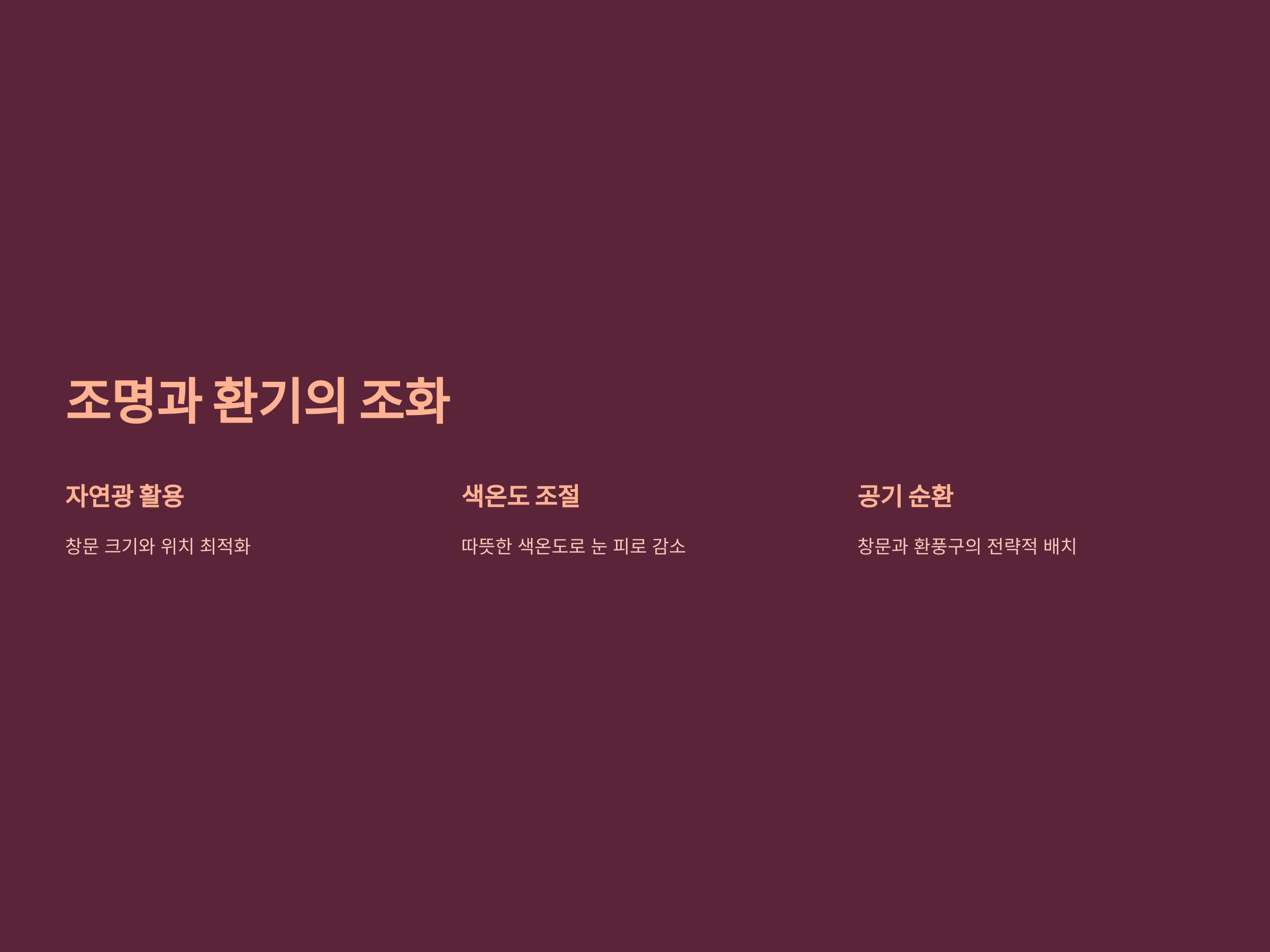 조명과 환기는 서재와 작업실의 분위기를 좌우합니다. 자연광을 최대한 활용하되, 해가 진 이후에는 눈의 피로를 줄여주는 따뜻한 색온도의 조명을 설치하는 것이 좋습니다. 또한, 장시간 머무는 공간인 만큼 공기 순환이 원활해야 집중력 저하를 방지할 수 있습니다. 창문과 환풍구를 적절히 배치해 쾌적함을 유지해보세요.