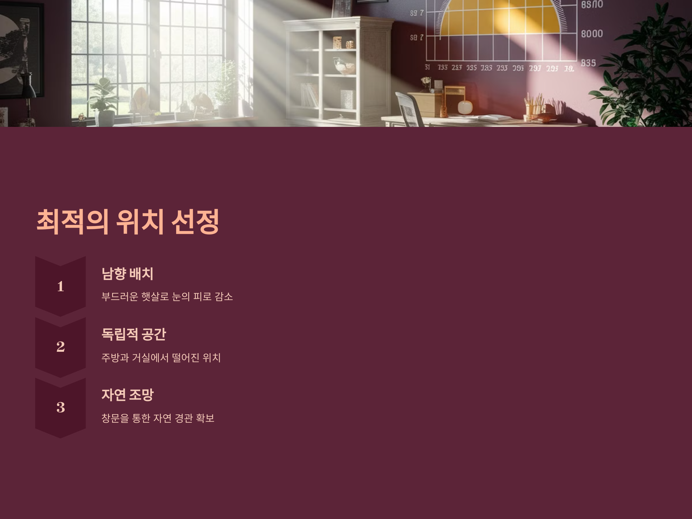 서재와 작업실의 위치 선정은 생각보다 중요합니다. 빛과 소음, 그리고 동선까지 고려해야 최고의 공간이 나오기 때문이죠. 전원주택이라면 남향 창이 있는 벽면 근처에 배치하는 것이 좋습니다. 햇살이 부드럽게 들어오는 시간대에 작업과 독서를 즐길 수 있어 눈의 피로도를 줄여주고, 하루의 리듬도 자연스럽게 유지할 수 있습니다. 또한 주방이나 거실과는 조금 떨어진 독립적인 공간에 구성하는 것이 집중도를 높이는 데 유리합니다. 이처럼 전원주택 내 최적의 위치를 잡아주는 것만으로도 생산성과 만족도를 크게 높일 수 있습니다.