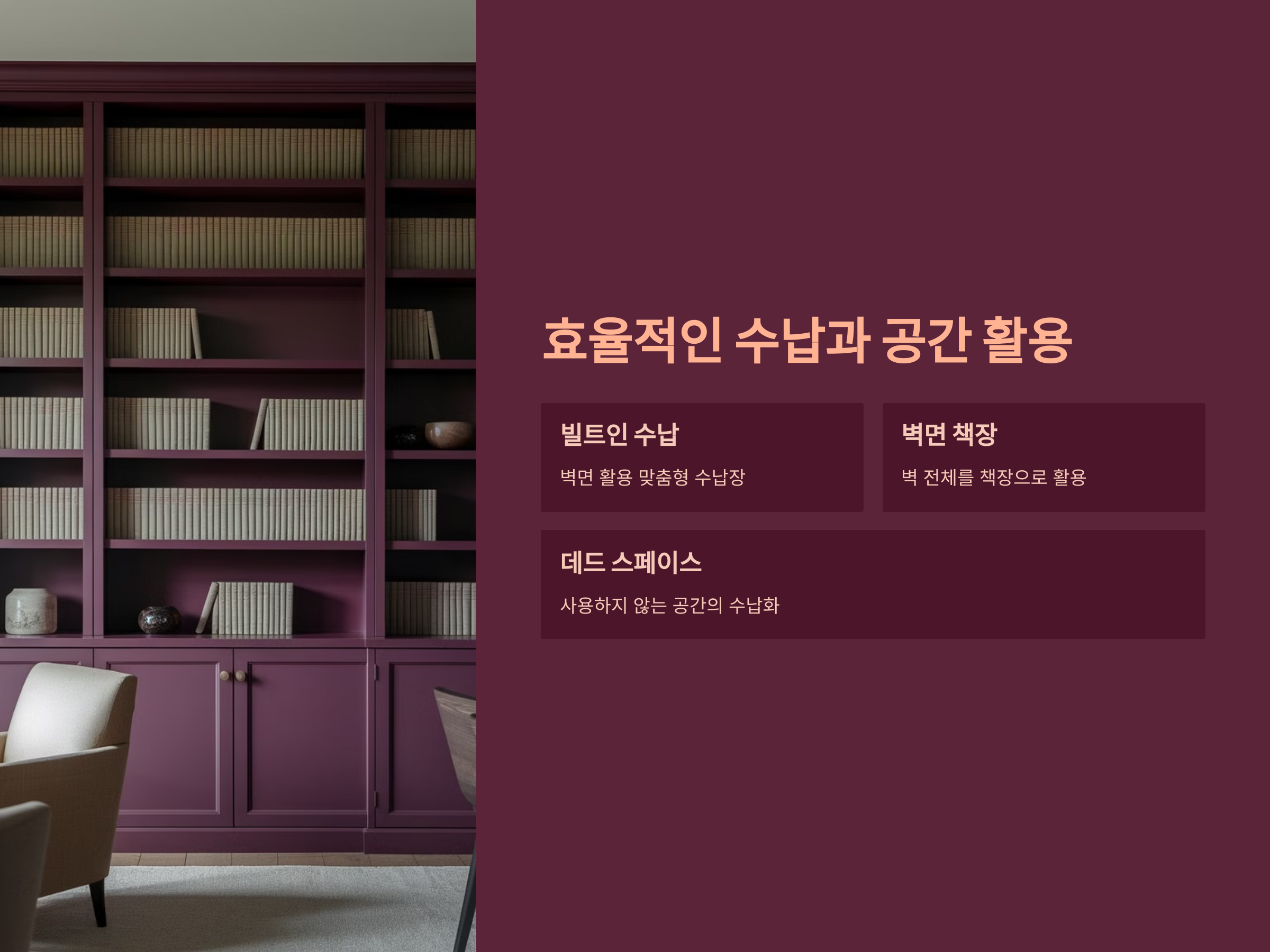 서재와 작업실은 언제나 깔끔하게 유지되는 것이 중요합니다. 이를 위해 빌트인 수납장, 벽면 선반 등을 적극 활용해 공간을 절약하면서도 필요한 자료와 물품을 정리정돈하기 쉽도록 구성해야 합니다. 최근 인기 있는 트렌드는 벽 전체를 책장으로 활용하거나, 데드 스페이스를 수납공간으로 변신시키는 것입니다. 작업 능률을 높이는 데 정리정돈은 필수니까요.