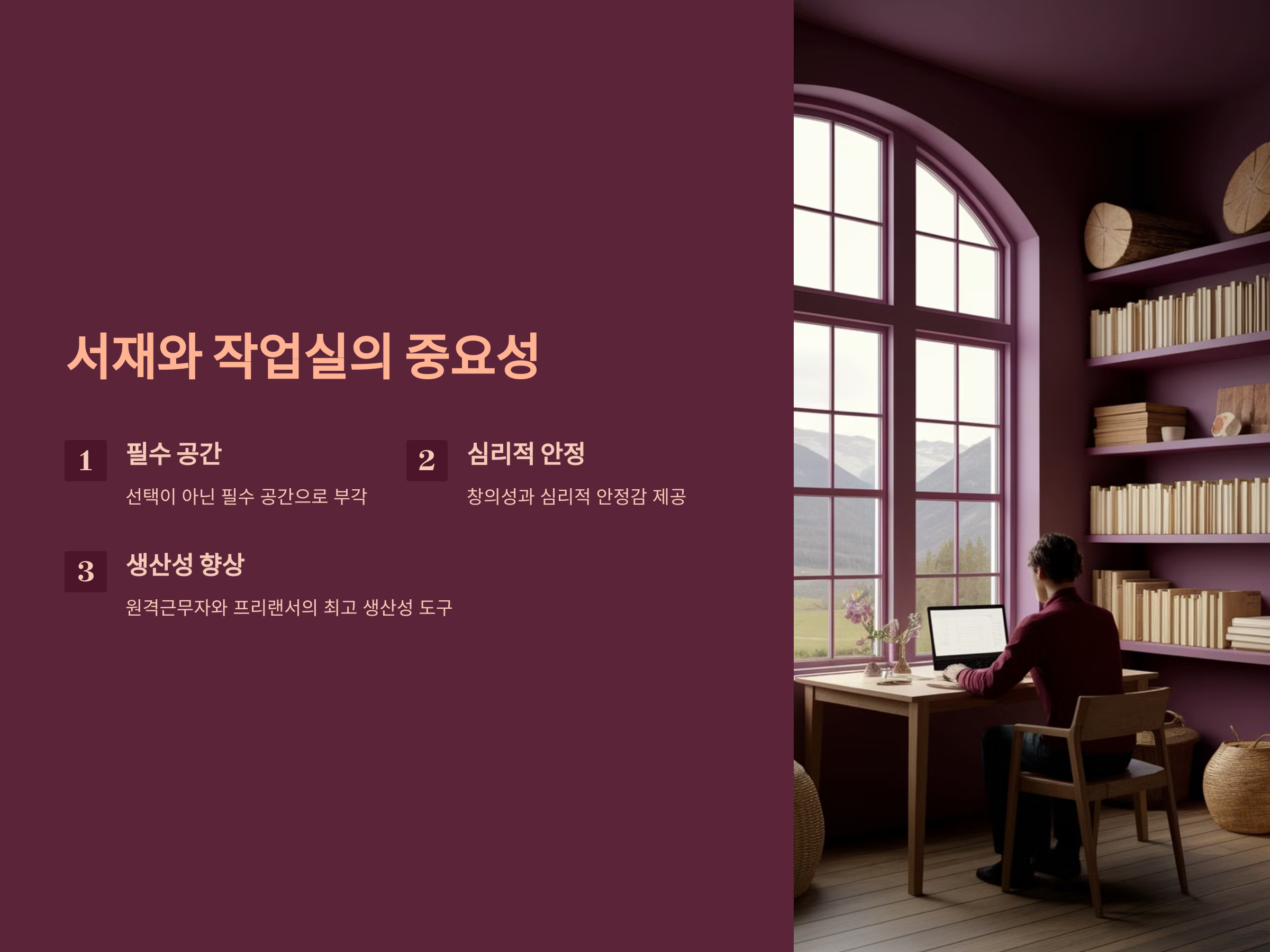 요즘 전원주택에 대한 관심이 높아지면서 단순한 주거 공간을 넘어 나만의 서재와 작업실을 갖추려는 수요가 급증하고 있습니다. 특히, 2024년 들어 재택근무와 원격 학습이 일상이 되면서, 자연 속에서 업무와 독서를 즐길 수 있는 공간 구성에 대한 트렌드가 새롭게 부각되고 있죠. 최근 인테리어 업계에서는 "자연 친화적 소재"와 "열린 구조"를 활용한 전원주택 서재 및 작업실 설계가 각광받고 있으며, 향후 이러한 공간 활용이 자산 가치 상승에도 긍정적인 영향을 줄 것이라는 전망이 나오고 있습니다. 이번 글에서는 전원주택 안에 나만의 서재와 작업실을 효율적으로 구성하는 노하우를 소개합니다. 최신 트렌드와 전문가 팁을 반영해 쾌적하면서도 생산적인 공간을 만들 수 있도록 돕겠습니다. 끝까지 읽고 따라 하면, 당신의 전원생활이 훨씬 더 풍요로워질 거예요.