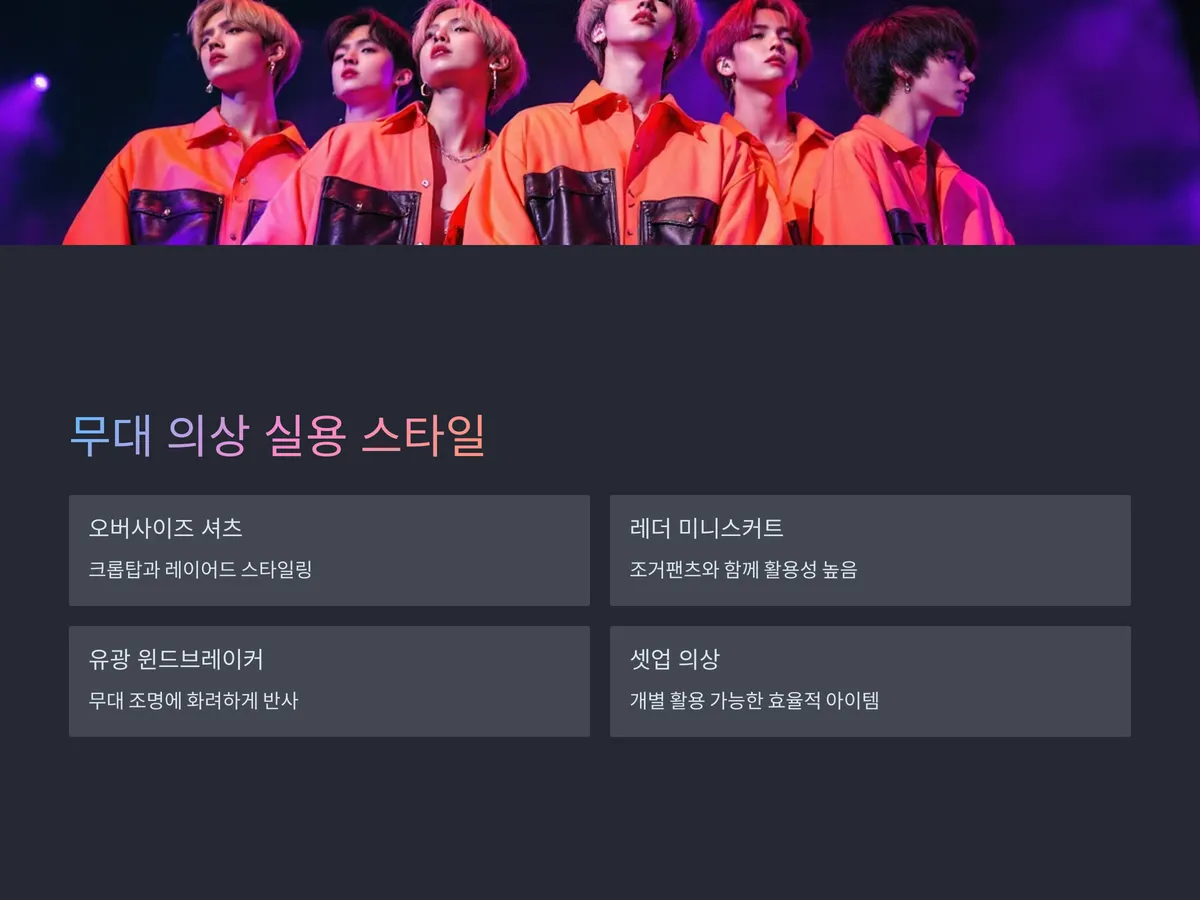아이돌은 일상복과 무대복의 경계가 흐려지는 경우가 많습니다. 이때 실용성과 스타일을 모두 갖춘 아이템이 필요합니다. 대표적인 아이템으로는 오버사이즈 셔츠와 크롭탑 레이어드, 레더 미니스커트 혹은 조거팬츠, 유광 소재의 윈드브레이커 등이 있습니다. 최근에는 Y2K 트렌드의 영향으로 반짝이는 패브릭과 메탈릭 톤이 인기를 얻고 있으며, 이러한 스타일은 무대 조명에 더욱 화려하게 반사되어 퍼포먼스에 강한 인상을 줍니다.