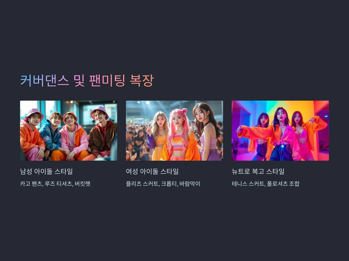 팬과의 소통에서도 아이돌은 무대만큼이나 이미지 관리가 중요합니다. 팬미팅이나 커버댄스 공연 시에는 너무 과하지 않으면서도 아이덴티티를 보여줄 수 있는 스타일이 요구되며, 최근에는 뉴트로풍의 복고 스타일이나 테니스 스커트와 폴로셔츠, 와이드 핏 팬츠와 트랙탑 조합이 대세입니다.