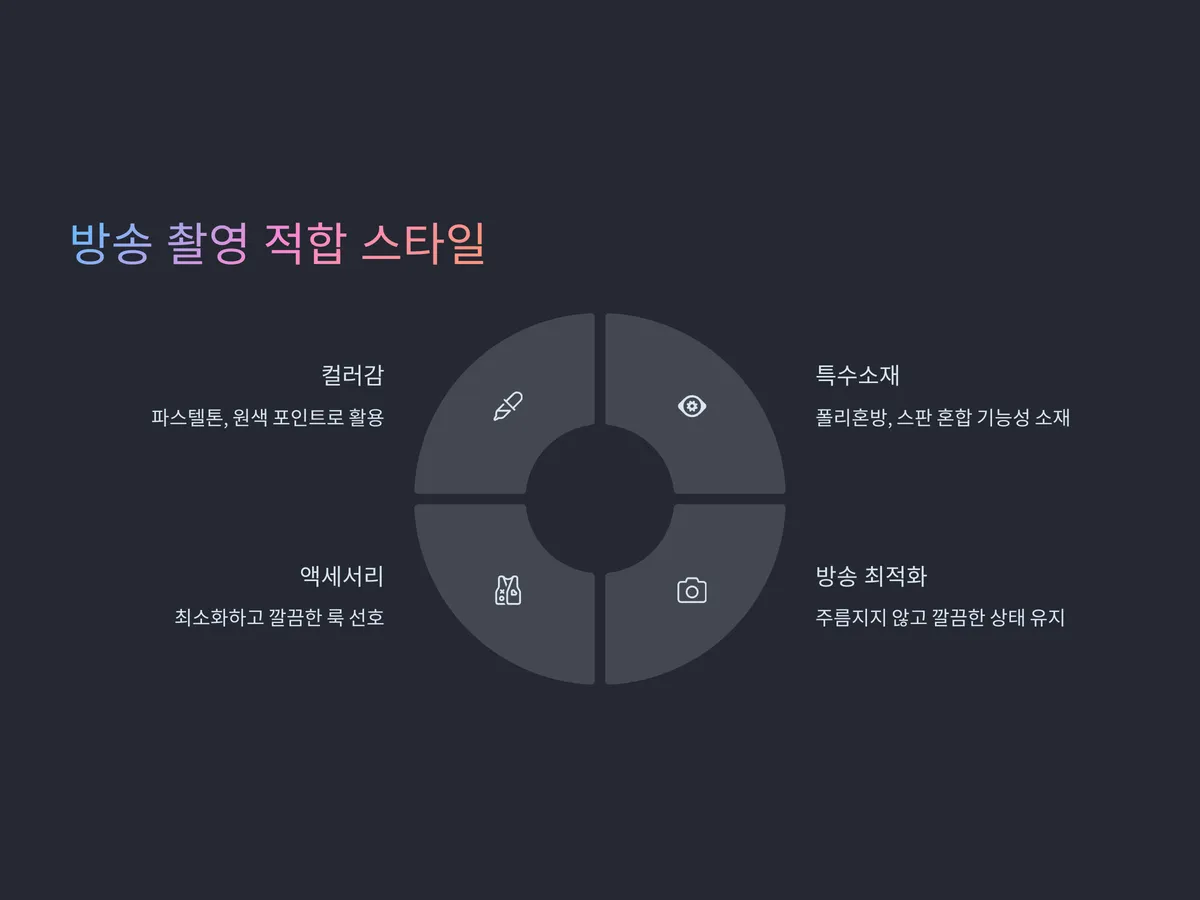 또한 방송 중 다양한 동작에도 주름지지 않고 깔끔한 상태를 유지할 수 있는 소재의 선택이 중요합니다. 대표적인 예로 폴리혼방, 스판 혼합 기능성 소재, 가벼운 니트소재 등이 있으며, 이는 착용자의 움직임을 따라 유연하게 늘어나면서도 복원력이 뛰어납니다. 액세서리는 가급적 최소화하고, 헤어와 메이크업이 강조될 수 있는 깔끔한 룩이 선호됩니다.