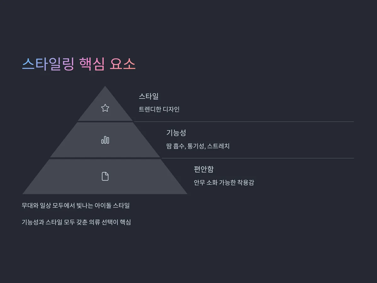 아이돌이 실제로 착용하는 의상 중에는 일상복으로도 자연스럽게 활용 가능한 제품이 많습니다. 이는 연습복의 편안함과 트렌디한 디자인이 접목된 경우가 많기 때문인데요. 대표적으로 데일리 트레이닝 셋업, 플리스 집업, 에센셜 티셔츠와 같은 아이템들이 있습니다. 특히 에어리즘 기능성 소재, 쿨링 니트, 리넨 코튼 혼방 소재는 여름 시즌에도 땀 걱정 없이 입기 좋고, 세탁과 관리가 용이하다는 점에서 인기를 끌고 있습니다.