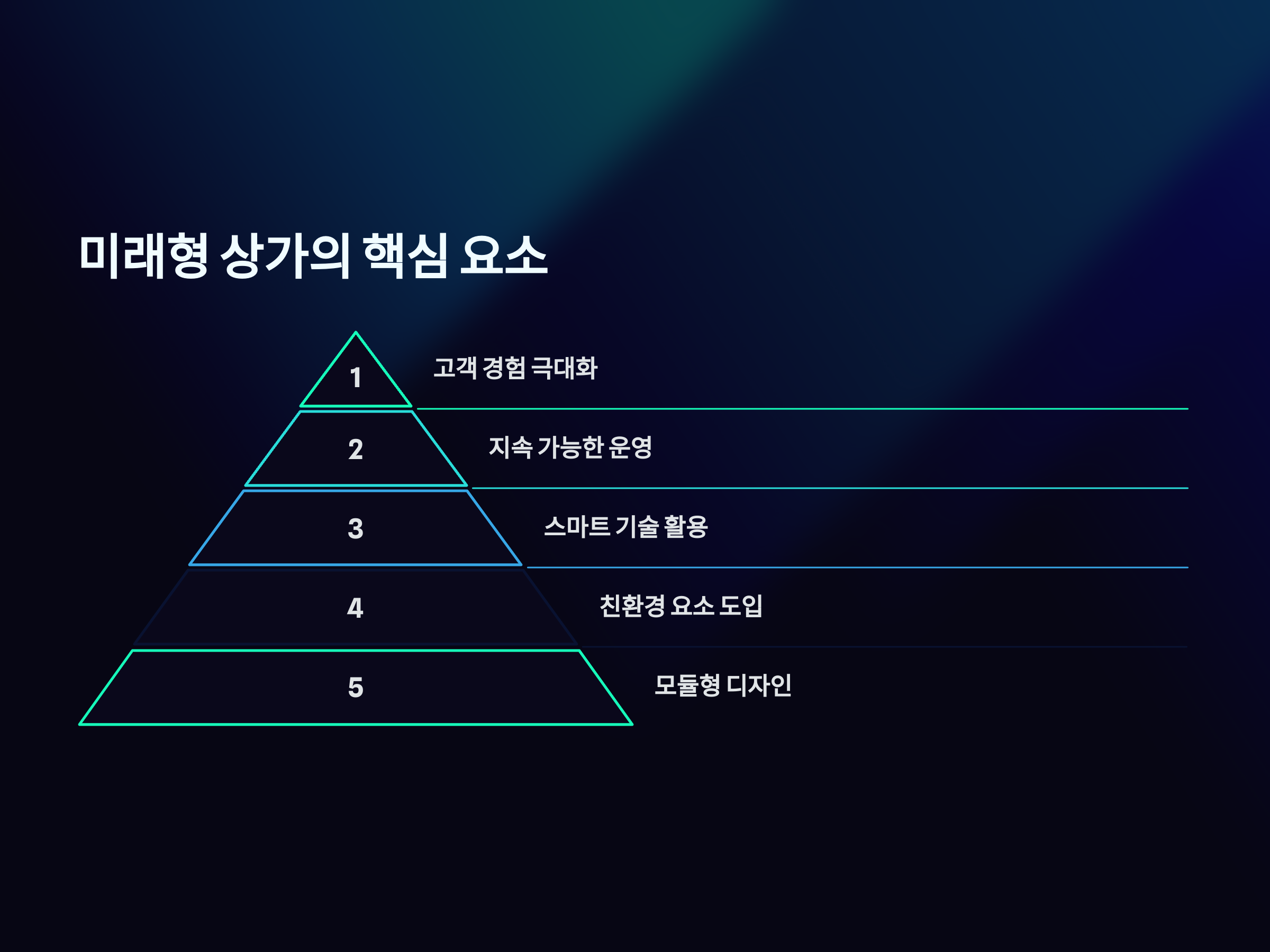 미래형 상가 디자인은 단순한 상업 공간이 아니라, 고객 경험을 극대화하고 지속 가능한 운영이 가능한 공간으로 변화하고 있습니다. 스마트 기술, 친환경 요소, 모듈형 디자인, 감성적 경험, 데이터 활용 등이 핵심 요소가 될 것입니다. 이러한 트렌드를 적극 반영하여 차별화된 상업 공간을 조성하는 것이 경쟁력을 높이는 길입니