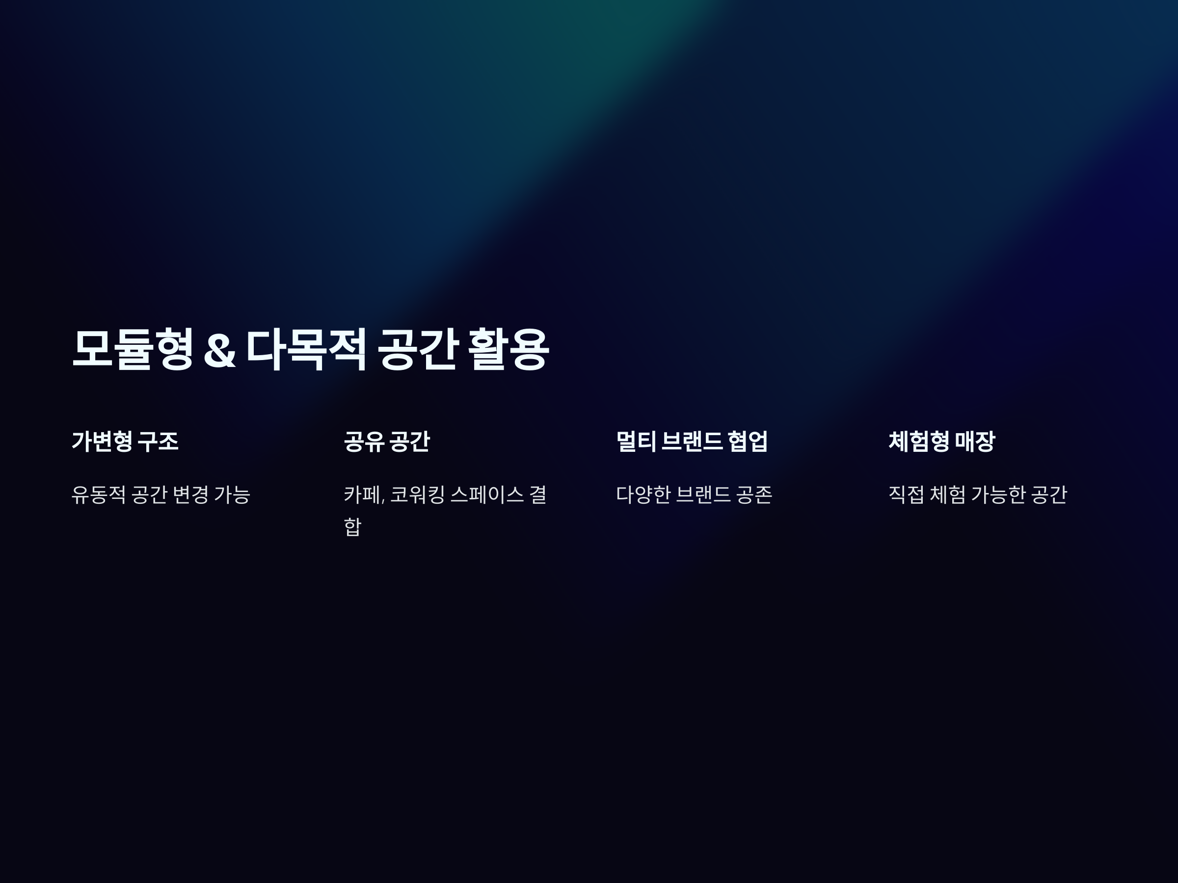 - 가변형 구조 도입: 가벽을 설치해 공간을 유동적으로 변경할 수 있도록 설계하여, 행사나 시즌별 레이아웃 변경이 용이합니다.