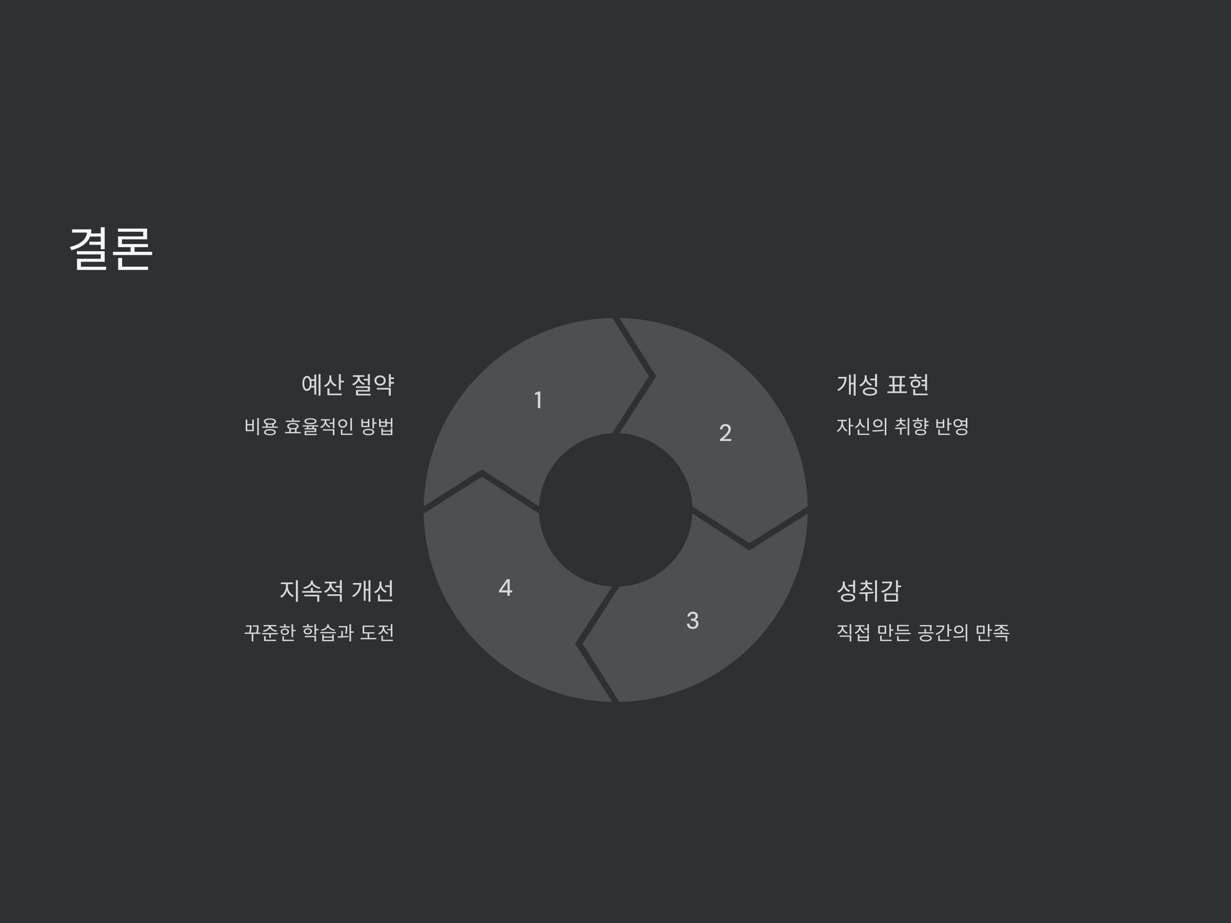 - 성취감: 직접 인테리어 작업을 완료하면 큰 성취감을 느낄 수 있습니다.