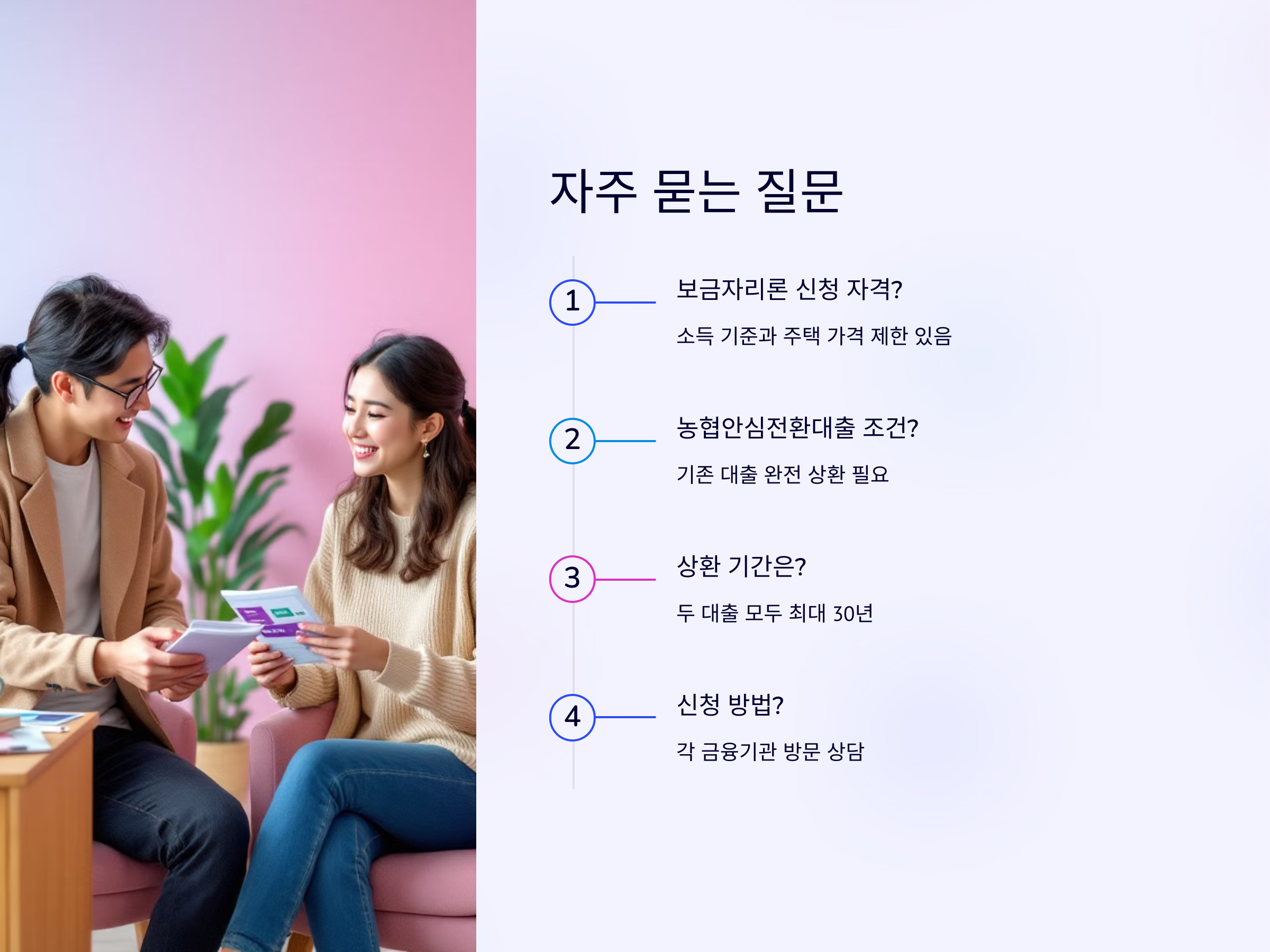 농협안심전환대출은 대출 전환을 원하는 고객들에게 주어지며, 기존 대출의 잔액을 상환하는 조건으로 진행됩니다. 따라서 보금자리론과는 목적과 대상이 다릅니다. 보금자리론은 처음 주택을 구입하는 사람들을 위한 대출이라면, 농협안심전환대출은 기존 대출을 재조정하는 사람들을 위한 상품입니다.