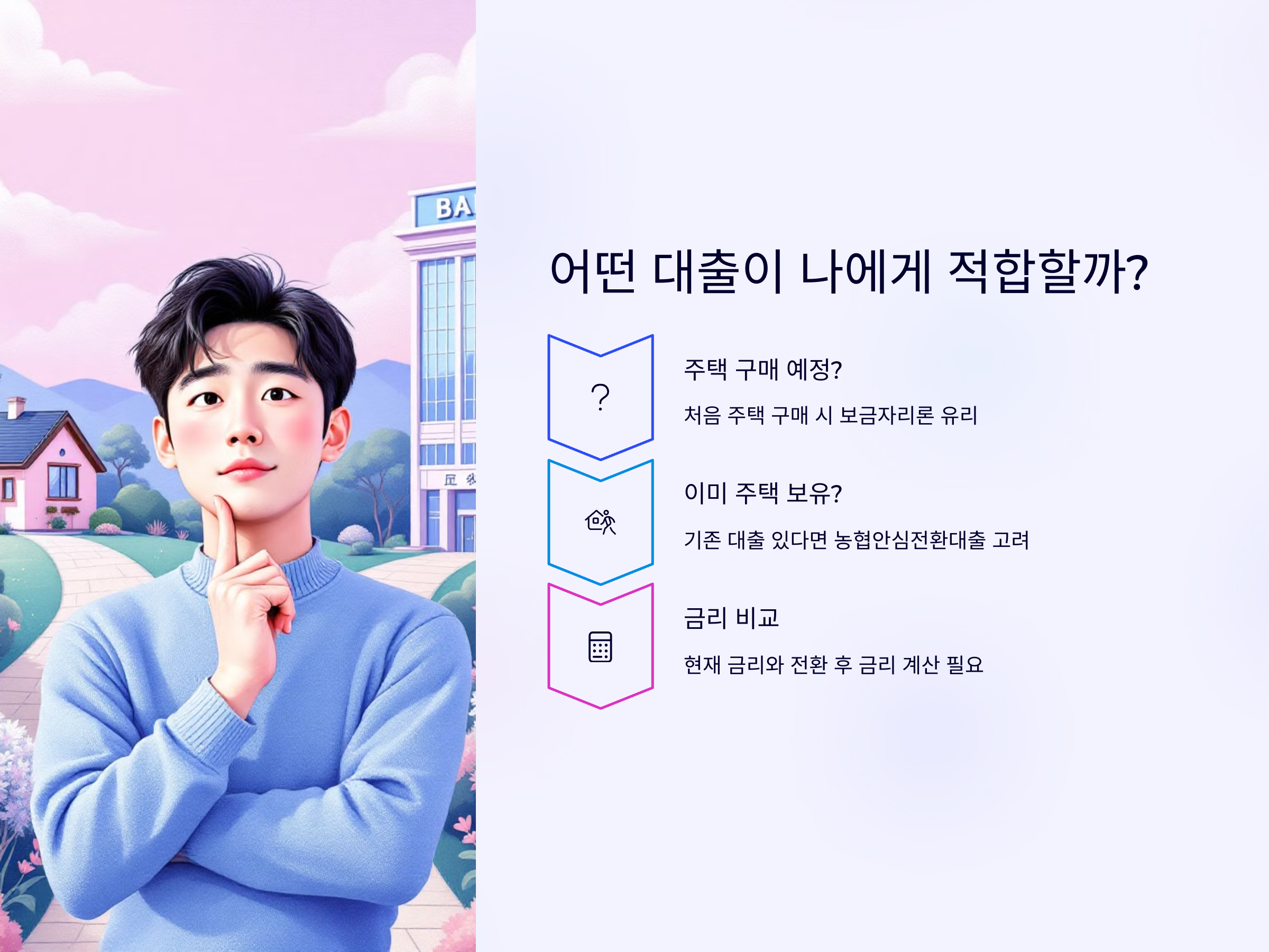 하지만 이미 주택을 구입한 상태에서 기존 대출의 금리가 높다면 농협안심전환대출을 고려하는 것이 좋습니다. 농협안심전환대출은 기존 고금리 대출을 더 낮은 금리로 전환할 수 있기 때문에, 장기적으로 더 많은 이자를 절약할 수 있습니다.