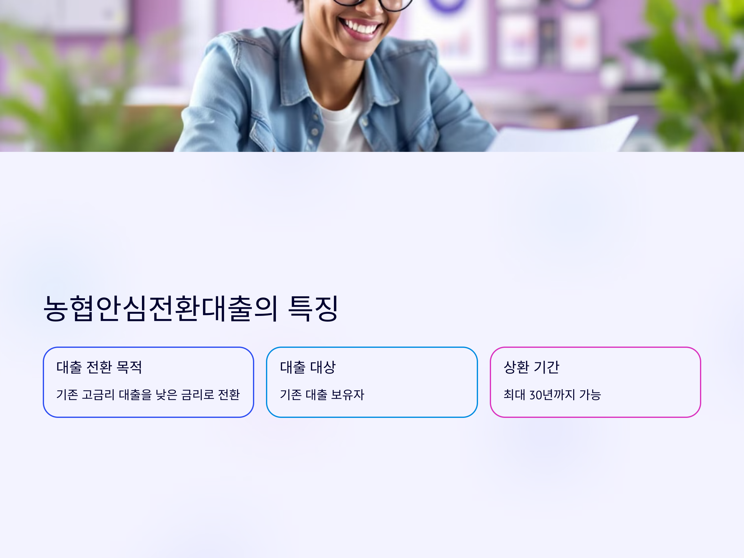 농협안심전환대출은 기존에 높은 금리의 대출을 가지고 있는 사람들이 더 낮은 금리로 전환할 수 있도록 도와주는 대출 상품입니다. 이 대출은 기존 대출을 상환하는 대신, 농협에서 새롭게 낮은 금리로 대출을 받을 수 있는 혜택을 제공합니다. 이 대출 상품은 특히 금리가 상승하는 시점에 기존의 고금리 대출을 부담스럽게 느끼는 사람들에게 유용합니다.