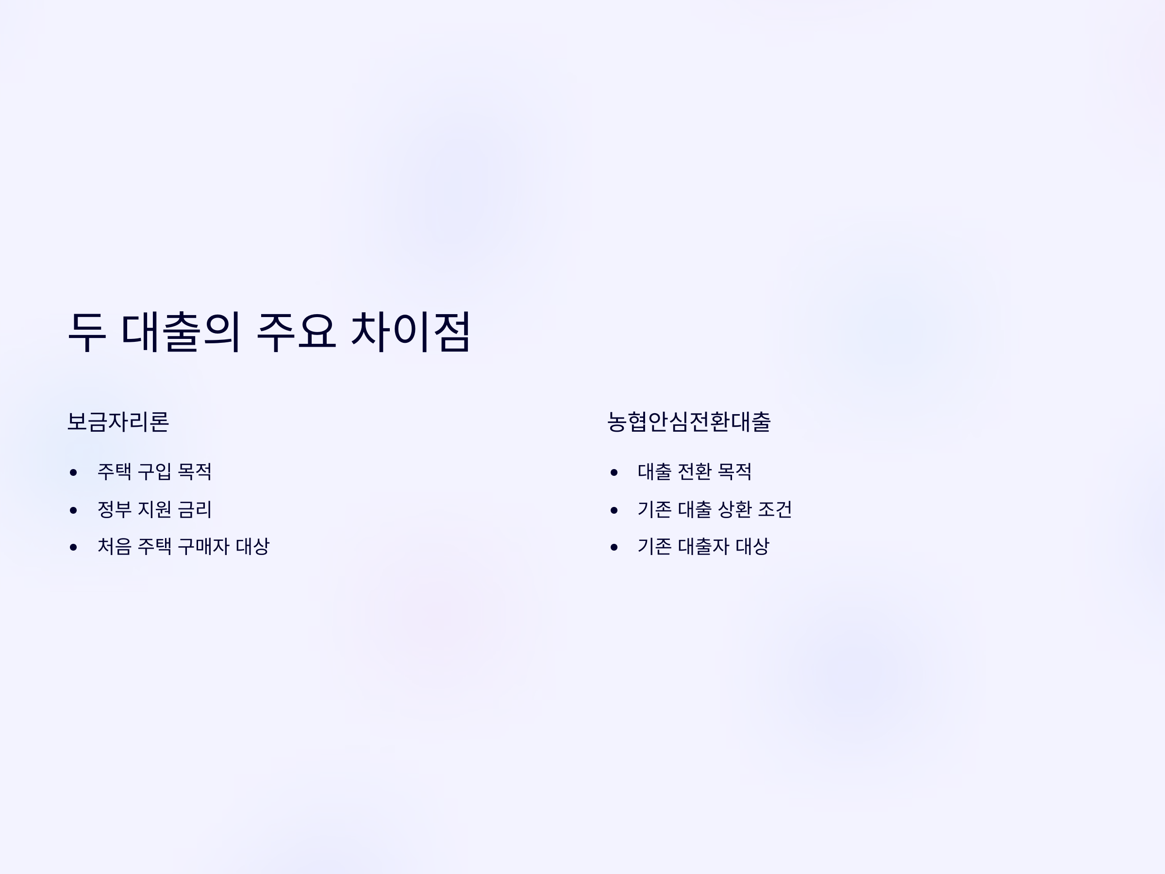 두 대출의 가장 큰 차이점은 대출 대상과 목적입니다. 보금자리론은 주택을 처음 구입하려는 사람을 위한 대출인 반면, 농협안심전환대출은 기존 대출을 상환하려는 사람을 위한 대출입니다. 또한 보금자리론은 정부가 지원하는 대출이므로 금리가 더욱 유리하며, 농협안심전환대출은 금리가 낮아진다는 점에서 기존 대출자의 부담을 덜어주는 역할을 합니다.