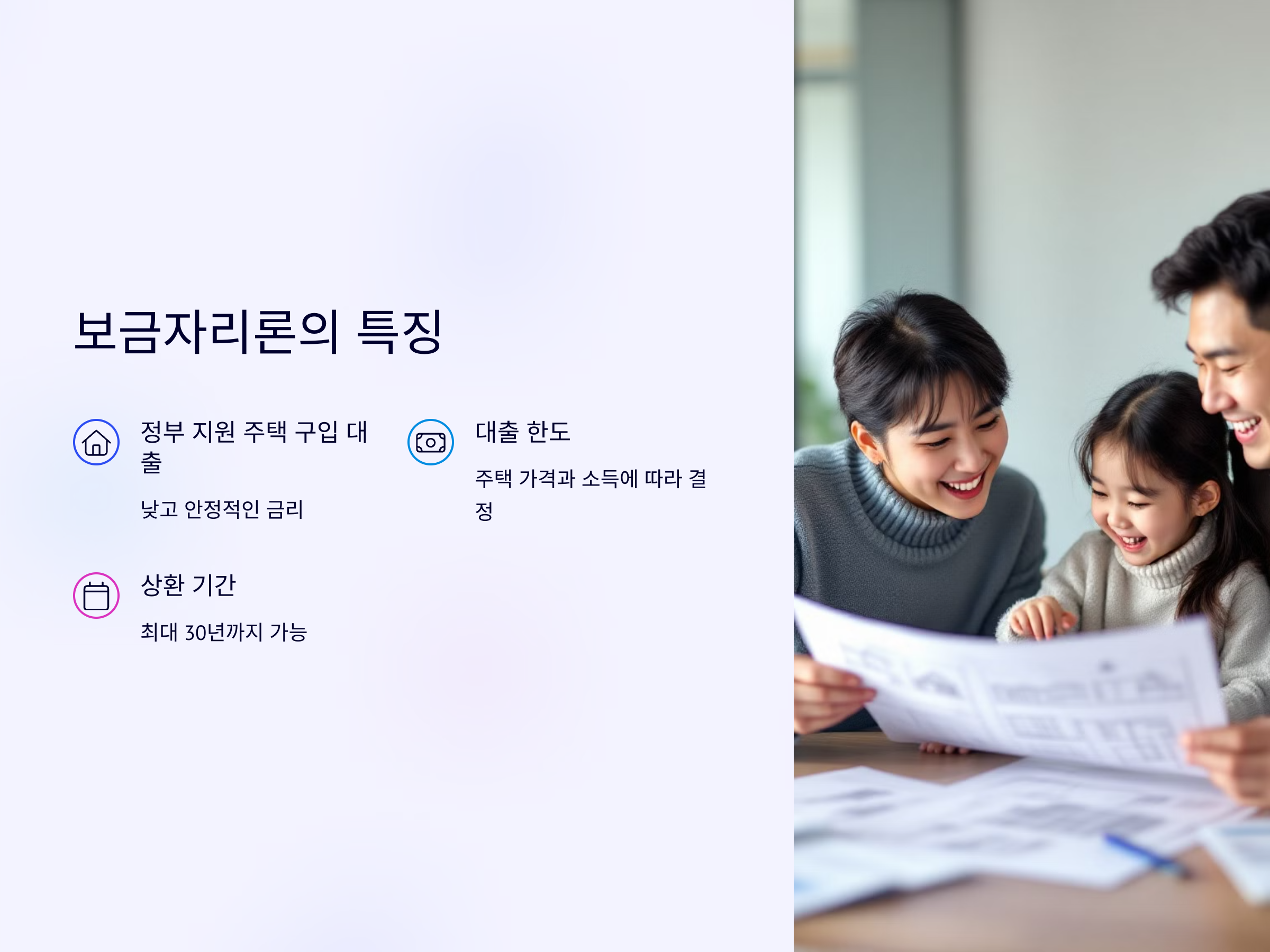 보금자리론은 정부에서 지원하는 주택 구입을 위한 대출 상품입니다. 이 대출은 주택을 구입하려는 사람들이 금리가 낮고 안정적인 조건으로 대출을 받을 수 있도록 도와줍니다. 보금자리론의 가장 큰 특징은 바로 정부가 보증하는 금리입니다. 이로 인해 상대적으로 낮은 금리로 장기 대출을 받을 수 있다는 장점이 있습니다.