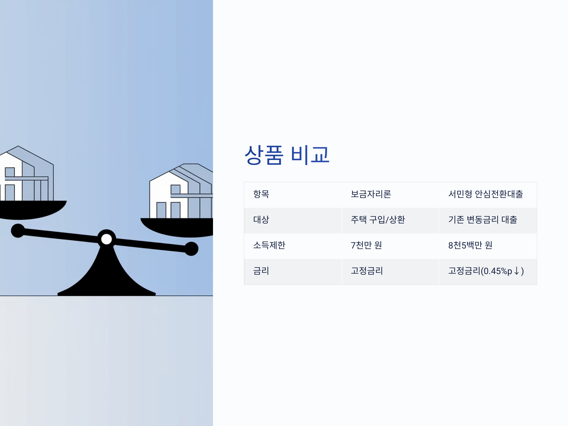 | 대출 대상 | 주택 구입자 또는 기존 대출 상환자 | 기존 변동금리 대출 보유자 |