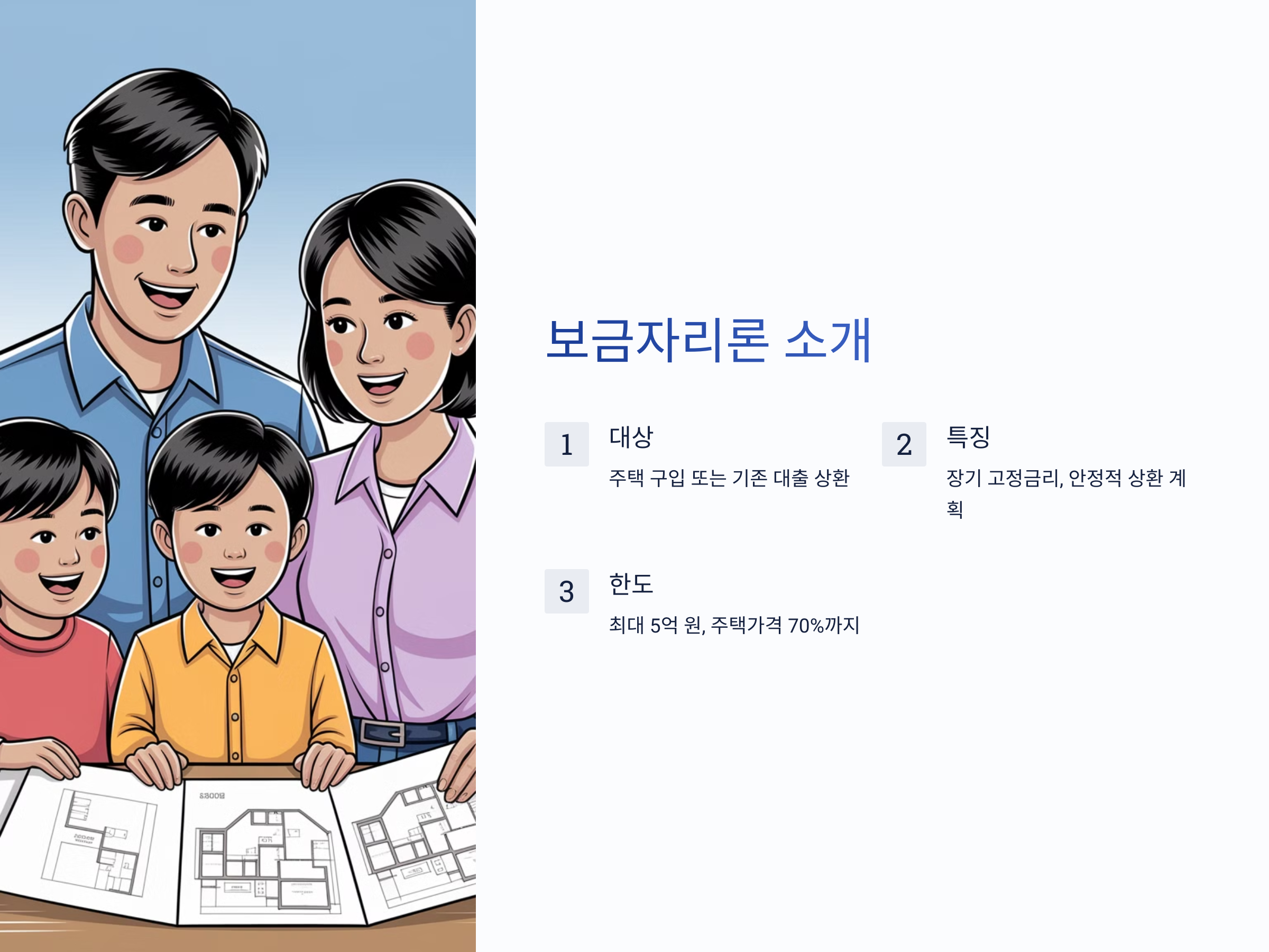 보금자리론은 한국주택금융공사에서 제공하는 장기 고정금리 주택담보대출 상품입니다. 주택을 구입하거나 기존 대출을 상환하려는 분들에게 유용하며, 금리 변동에 대한 걱정 없이 안정적인 상환 계획을 세울 수 있습니다.