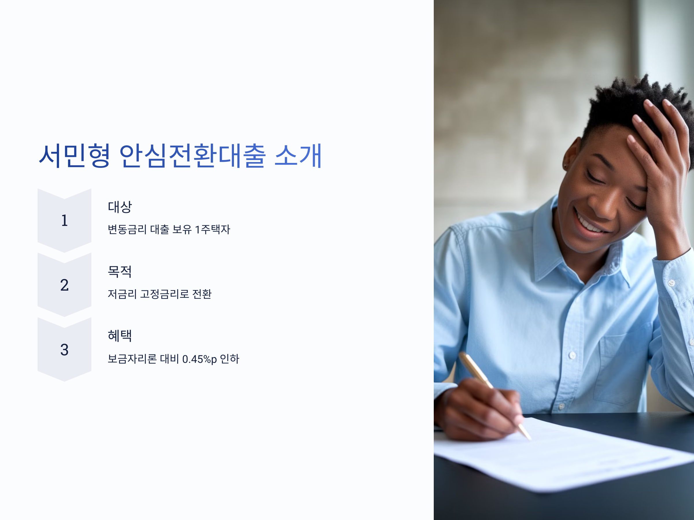 - 대출 대상: 기존에 변동금리 또는 준고정금리 주택담보대출을 보유한 1주택자
