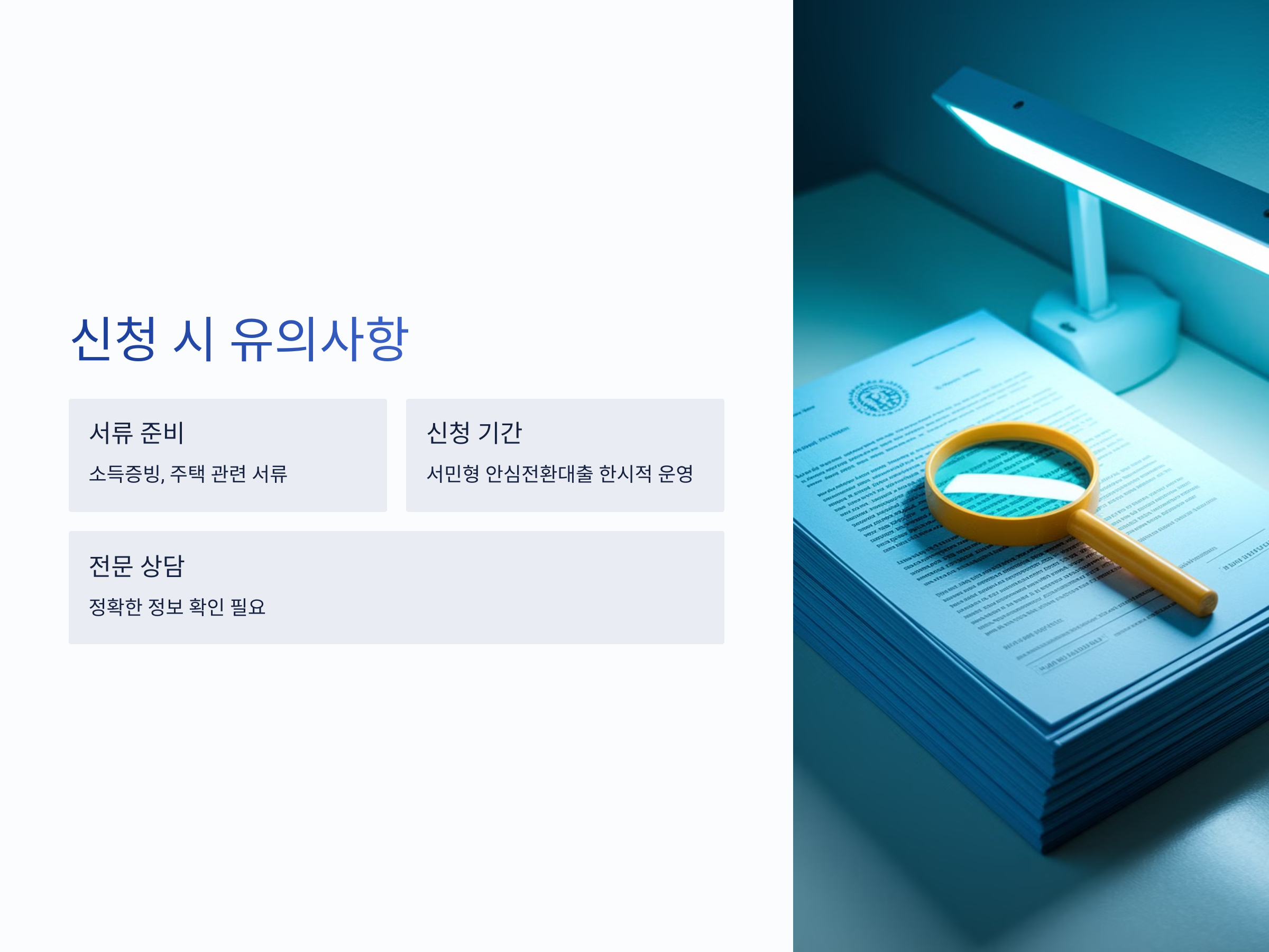 - 신청 기간: 서민형 안심전환대출은 한시적으로 운영되므로, 신청 기간을 반드시 확인해야 합니다.