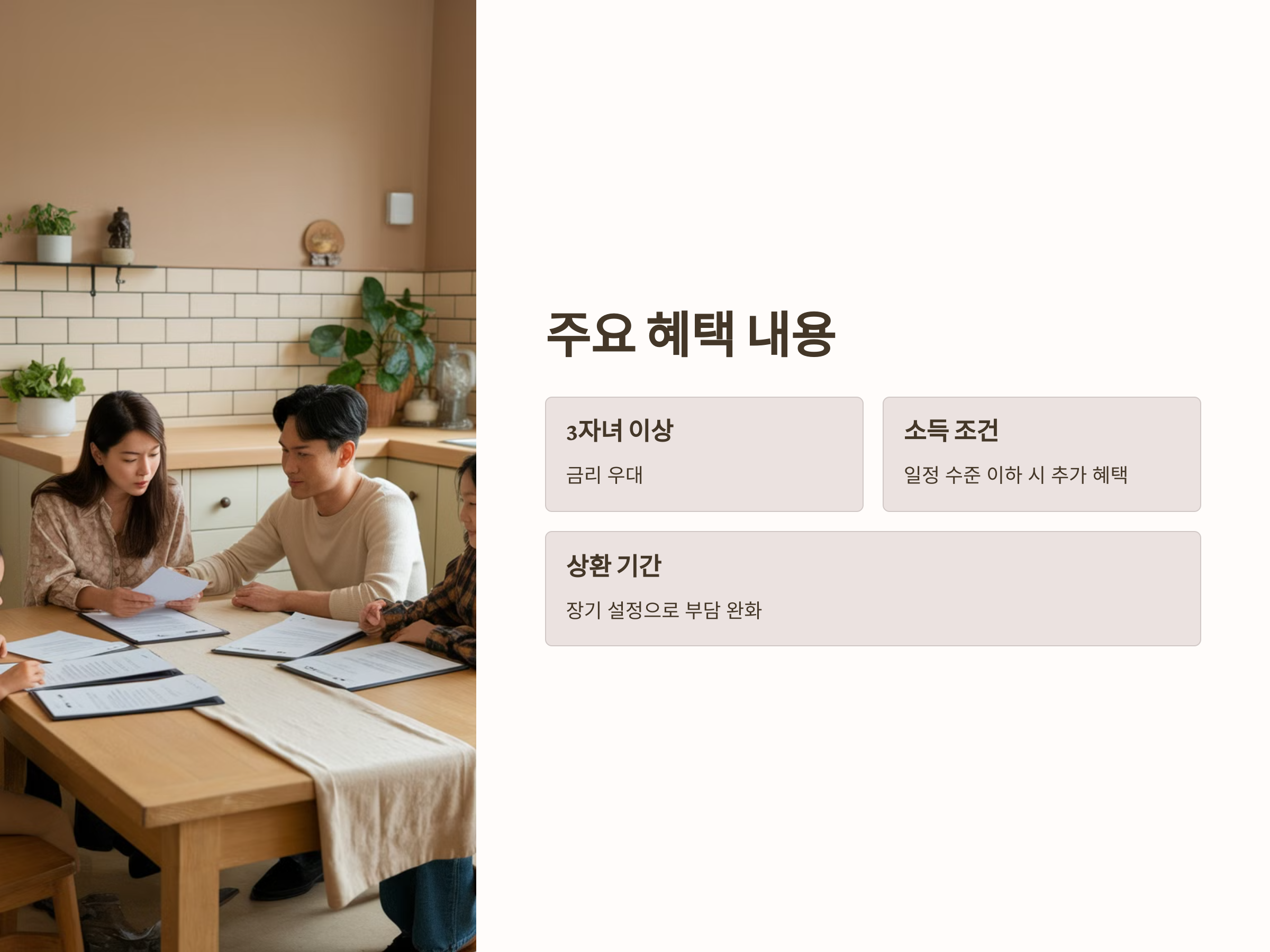 - 상환 기간: 장기적인 상환 기간을 설정하여 가구의 경제적 부담을 완화할 수 있습니다.