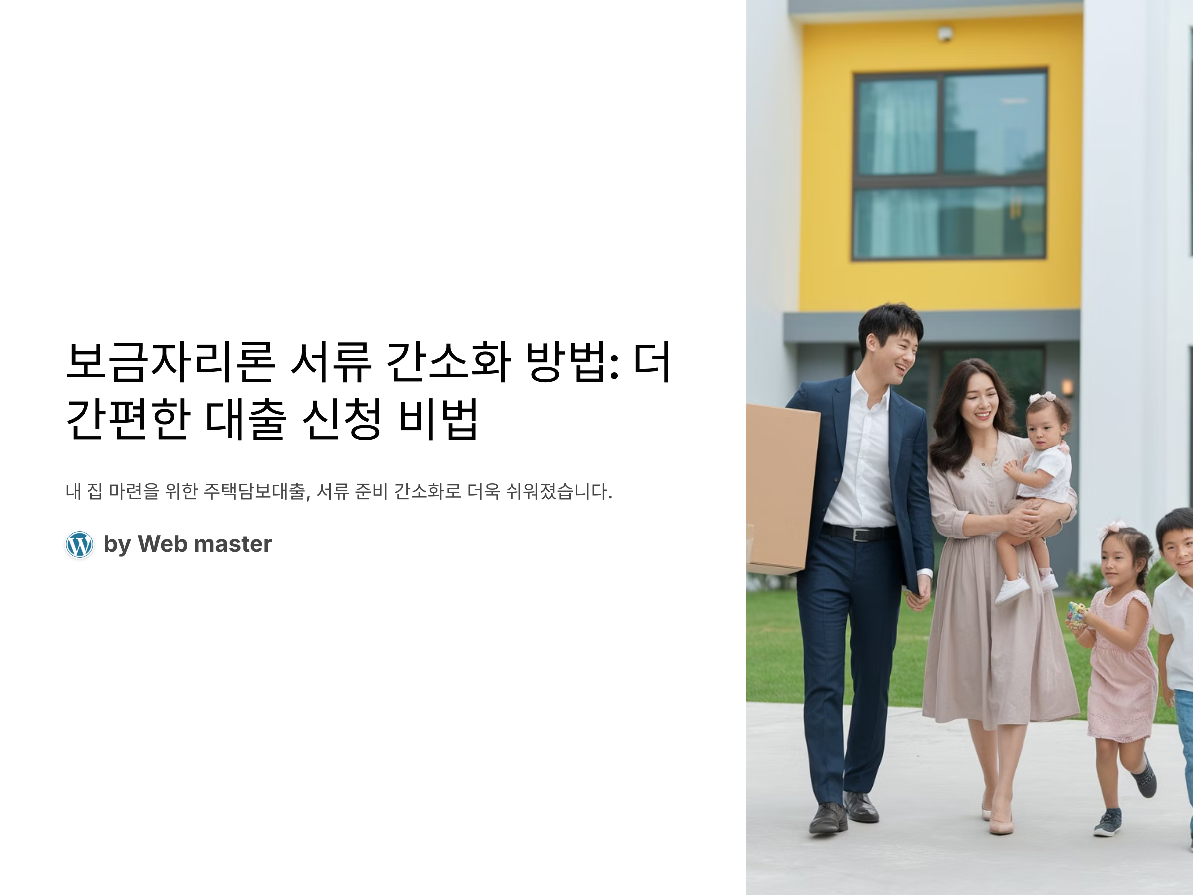 보금자리론의 서류 간소화는 대출 신청자에게 많은 혜택을 제공합니다. 전자 서류 제출, 정부 시스템 연계, 모바일 앱 활용 등 다양한 방법을 통해 복잡했던 대출 절차가 한층 간편해졌습니다. 하지만 여전히 서류 제출 시 주의해야 할 사항들이 있으므로, 대출 신청 전 필요한 서류를 미리 준비하고 정확하게 제출하는 것이 중요합니다. 이러한 서류 간소화 방법을 잘 활용하면, 내 집 마련의 꿈이 더 가까워질 수 있습니다.