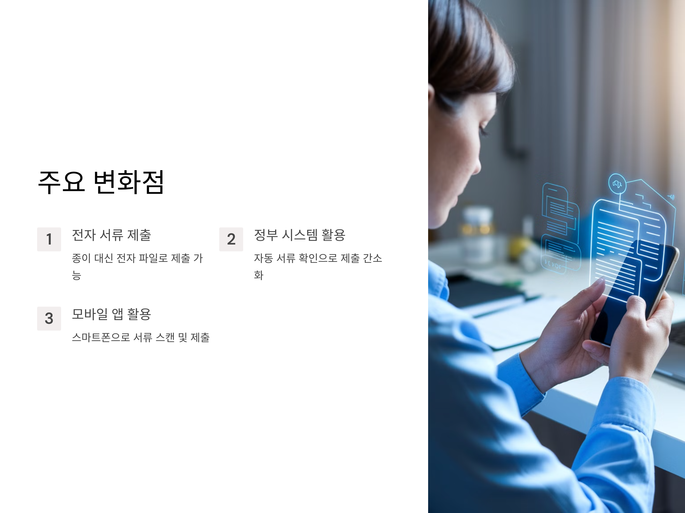 - 정부의 전자 시스템 활용: 정부의 전자 시스템을 통해 필요한 서류를 자동으로 확인할 수 있게 되었으며, 이를 통해 별도의 서류를 제출하지 않아도 되는 경우가 많아졌습니다. 예를 들어, 세무서에서 발급된 소득 증명서는 자동으로 제출 가능하도록 연계되었습니다.