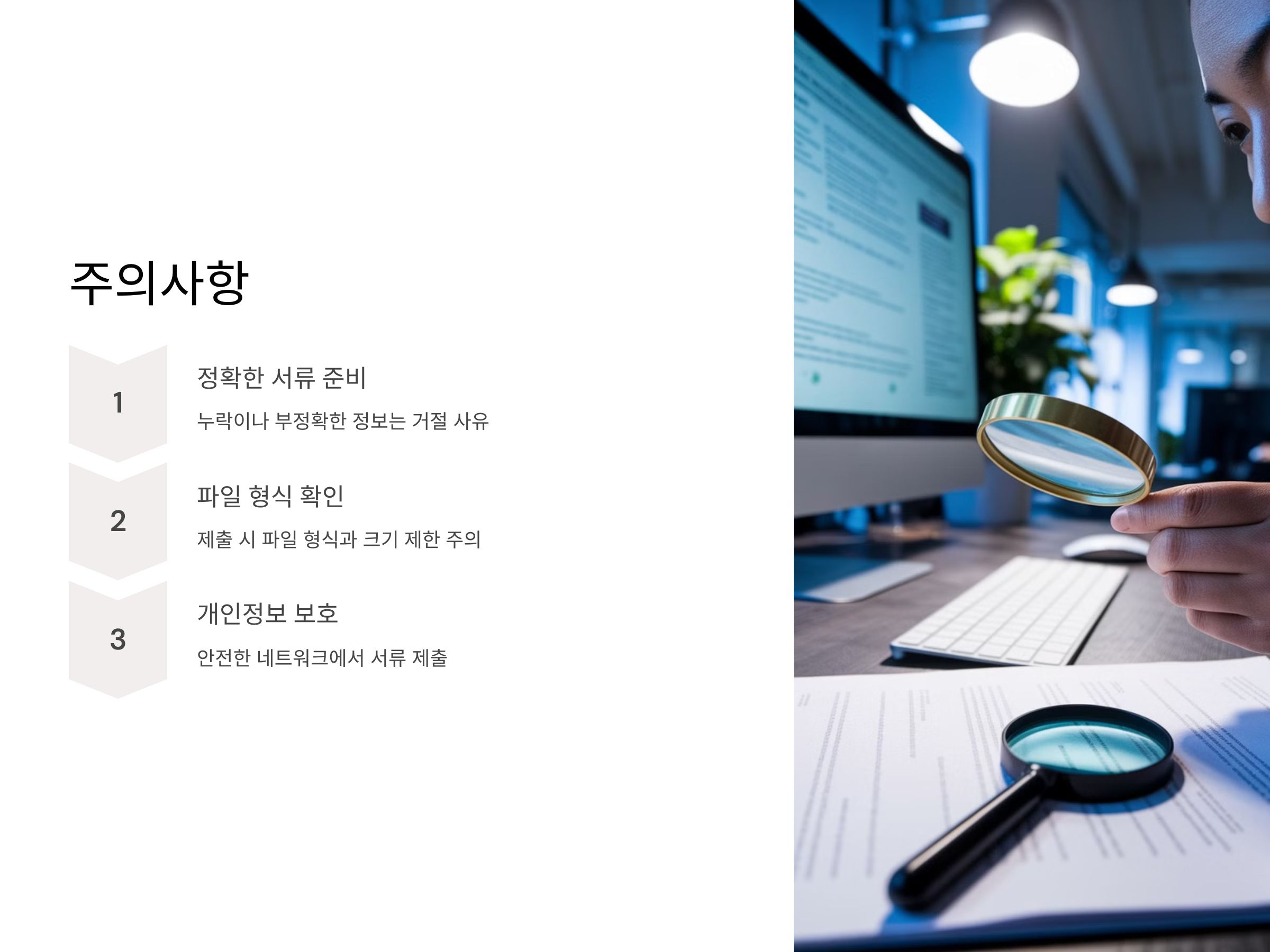 - 전자 서류 제출 가능: 이전에는 모든 서류를 종이로 제출해야 했지만, 이제는 일부 서류를 전자 파일 형식으로 제출할 수 있어 시간과 노력을 대폭 줄일 수 있습니다. 예를 들어, 주민등록등본, 소득증명서 등의 서류는 온라인으로 제출 가능합니다.