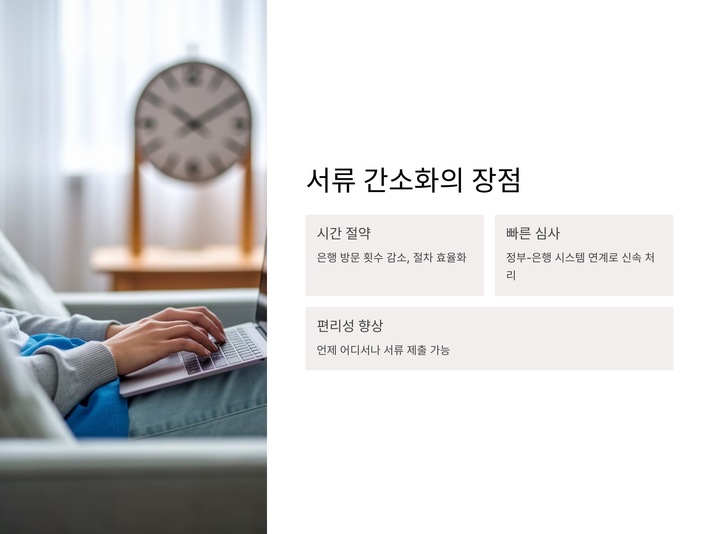 서류 간소화의 가장 큰 장점은 무엇보다 시간 절약입니다. 서류 준비와 제출이 간편해지면서 대출 신청자가 은행에 방문하는 횟수도 줄어들고, 전반적인 대출 절차가 효율적으로 진행됩니다. 또한, 정부 시스템과 은행 시스템의 연계로 대출 심사도 더 빠르고 정확하게 이루어지며, 대출 승인이 이루어지기까지의 시간이 단축됩니다.