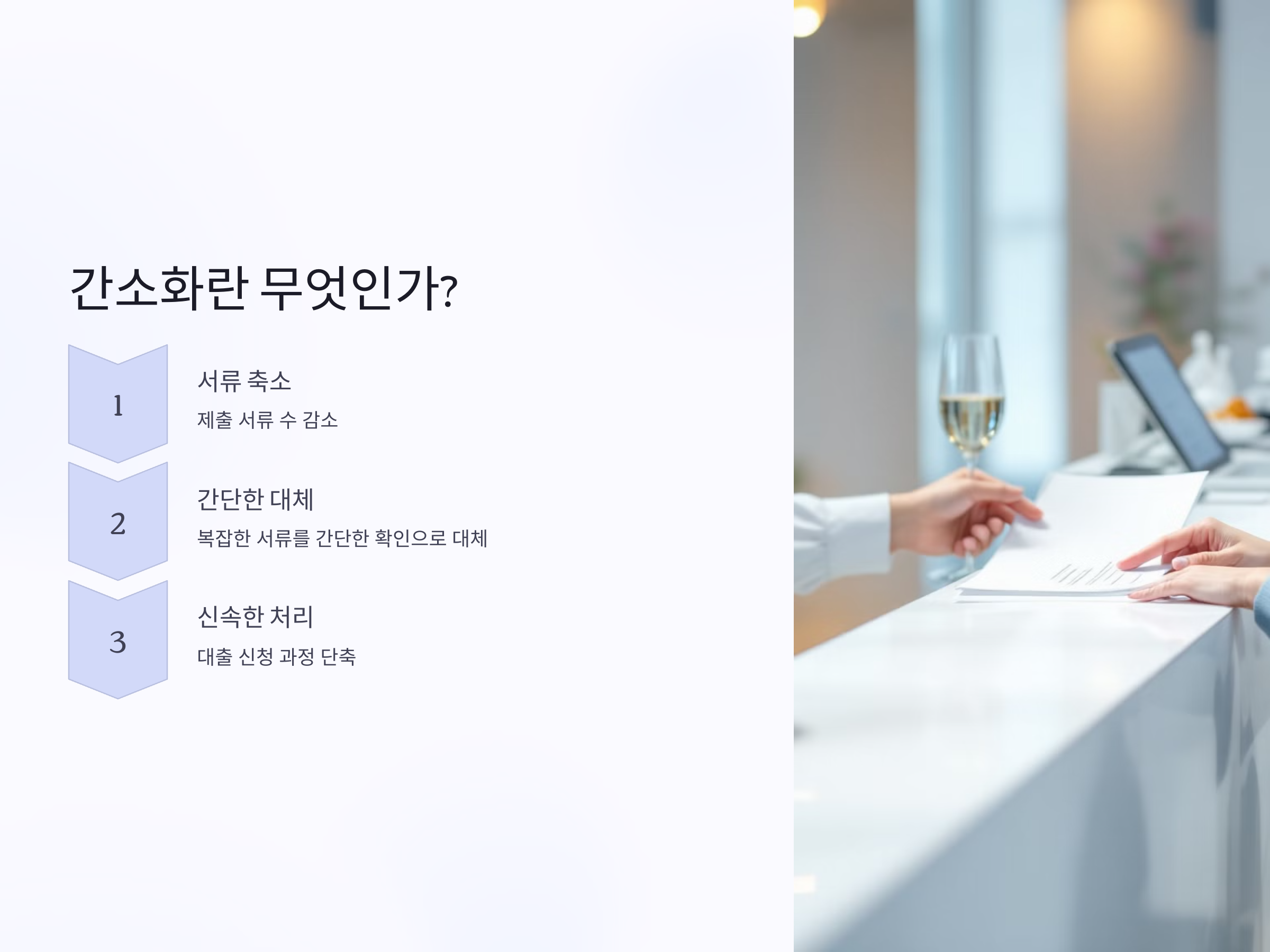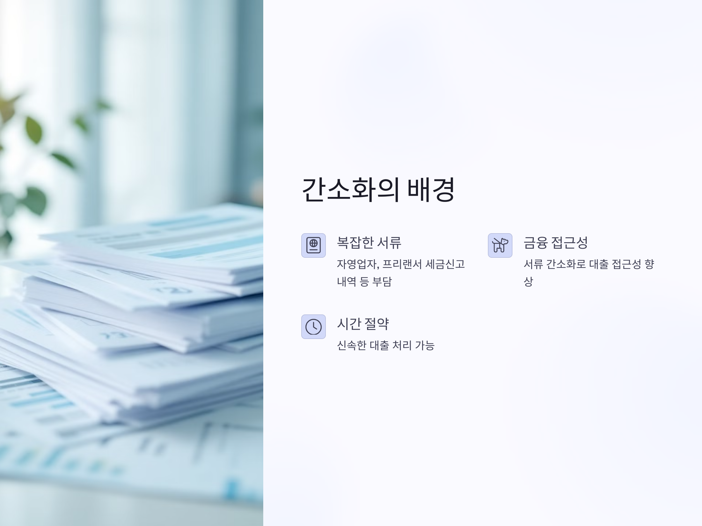 소득 증빙서류 간소화란, 대출 신청자가 제출해야 하는 소득 관련 서류를 줄이거나 간단한 서류로 대체하는 것을 의미합니다. 예를 들어, 기존에는 세금 납부 증명서나 소득금액증명원 등의 서류를 제출해야 했지만, 이번 간소화 이후로는 일부 서류가 생략되거나, 대신 간단한 본인 확인 절차로 대체될 수 있게 되었습니다. 이는 신청자가 보다 신속하게 대출을 받을 수 있도록 도와줍니다.