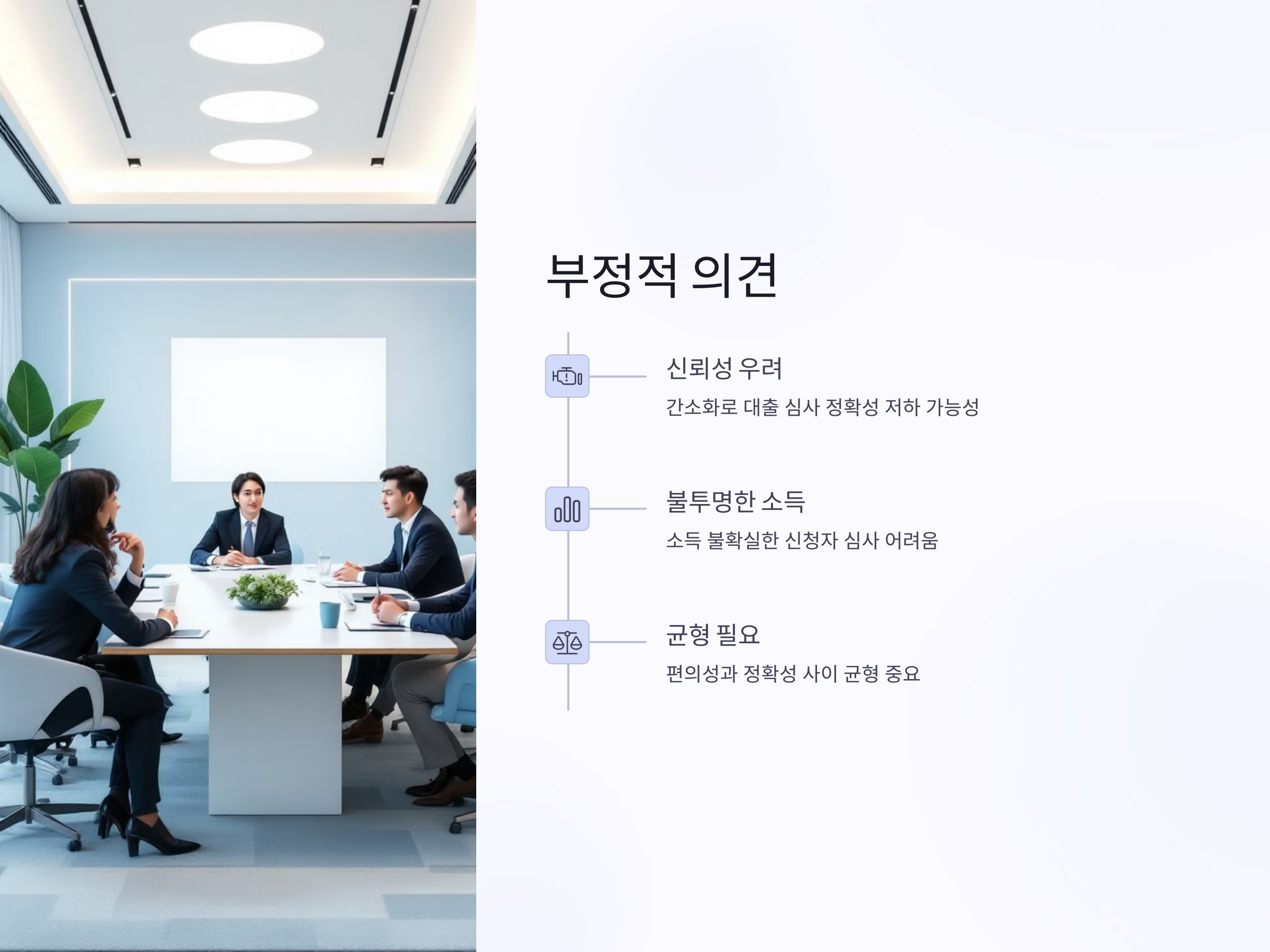 모든 변화가 긍정적인 결과만을 가져오는 것은 아닙니다. 소득 증빙서류 간소화에 대해 일부 전문가들은 지나치게 간소화된 서류 절차가 대출 심사에 신뢰성을 떨어뜨릴 수 있다는 우려를 표명하기도 했습니다. 예를 들어, 소득이 불확실하거나 불투명한 신청자가 간소화된 절차로 대출을 받을 경우, 이는 대출 심사의 정확성을 떨어뜨릴 수 있다는 점에서 논란이 일고 있습니다.