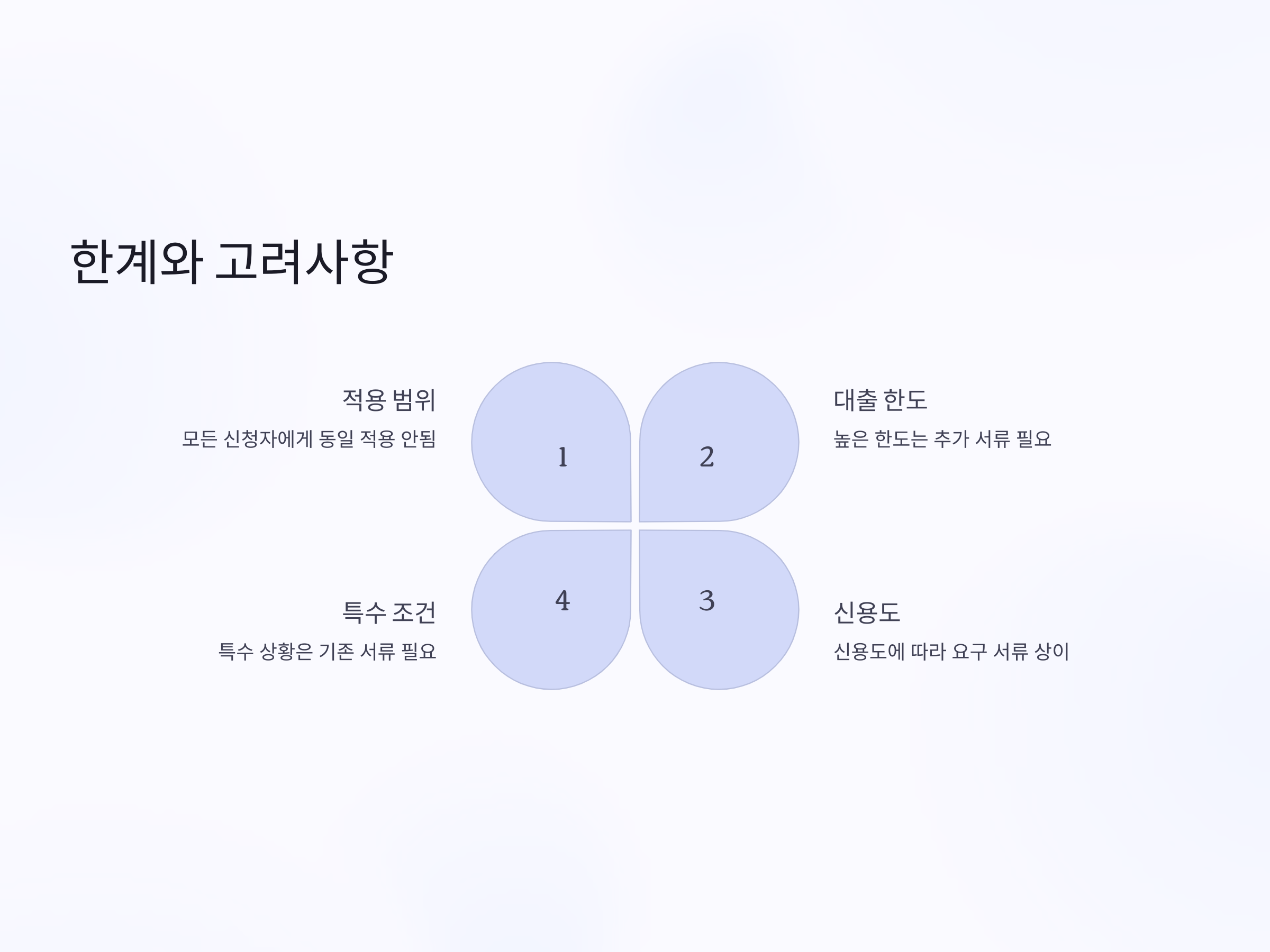 하지만 모든 대출 신청자가 이 혜택을 받을 수 있는 것은 아닙니다. 소득 증빙서류 간소화가 일부 대출 신청자에게만 적용될 수 있다는 점을 유의해야 합니다. 예를 들어, 대출 한도가 높은 경우나 특수한 조건을 갖춘 경우에는 여전히 많은 서류가 요구될 수 있습니다. 이러한 한계를 잘 이해하고, 자신에게 적용되는 서류를 미리 확인하는 것이 중요합니다.