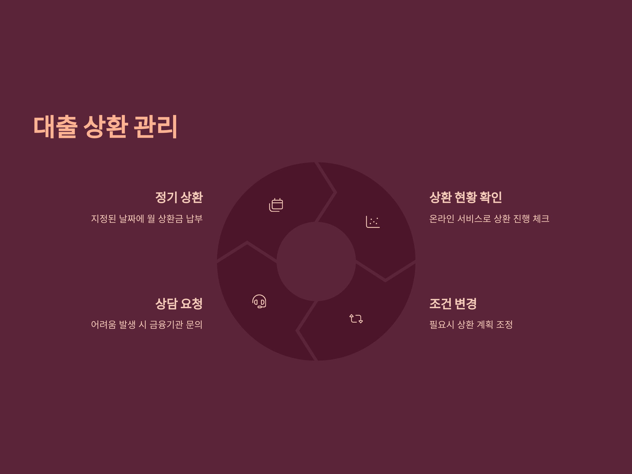 대출 상환은 정해진 날짜에 꾸준히 진행해야 하며, 만약 상환에 어려움이 생기면 사전에 금융기관에 문의하여 해결 방안을 모색해야 합니다. 대출 상환 계획은 주택금융공사에서 제공하는 온라인 서비스를 통해 쉽게 확인할 수 있습니다.