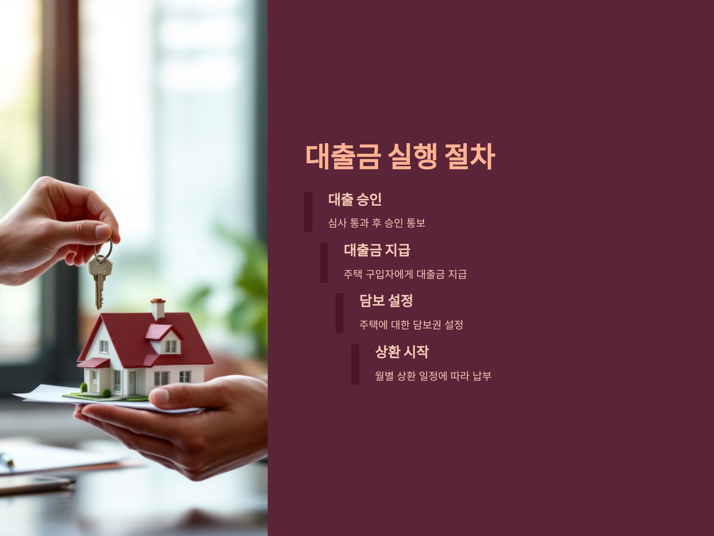 대출이 승인되면, 대출금이 신청한 주택 구입자에게 지급됩니다. 대출금은 주택 구입 자금으로 사용되며, 구매 계약서와 함께 주택 소유권 이전 절차가 진행됩니다. 이때 주택의 담보가 설정되며, 대출금의 상환이 시작됩니다.