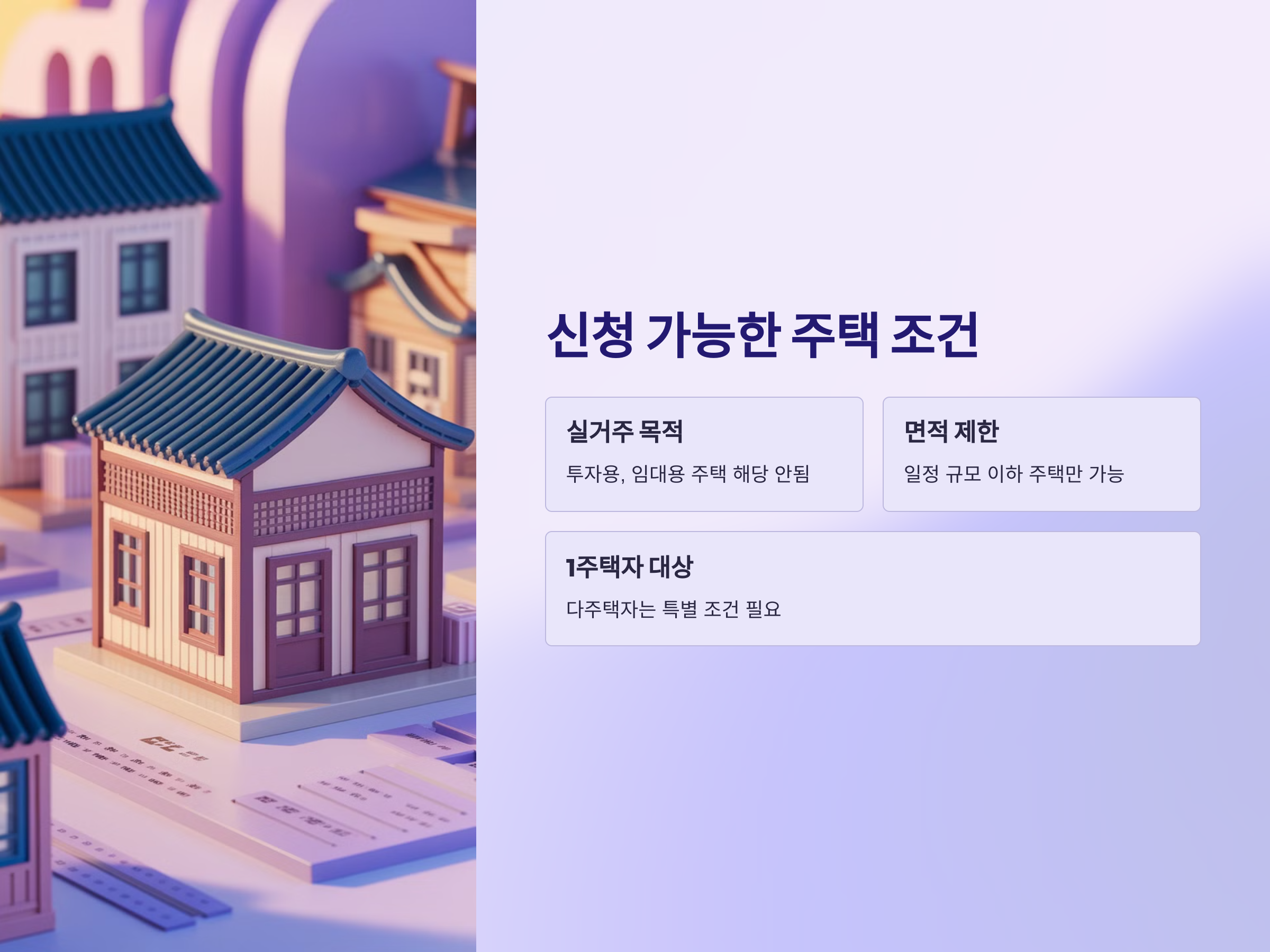 보금자리론 신청이 가능한 주택은 일정한 조건을 충족해야 합니다. 우선, 보금자리론은 기본적으로 "실거주 목적의 주택"이어야 하며, 일정 규모 이하의 주택이어야 합니다. 대출 금리는 주택의 유형과 크기, 그리고 해당 주택의 위치에 따라 달라지기도 합니다. 또한, 보금자리론은 "1주택자"를 대상으로 하는 경우가 많습니다. 다주택자는 일부 조건을 충족해야만 대출을 받을 수 있습니다.