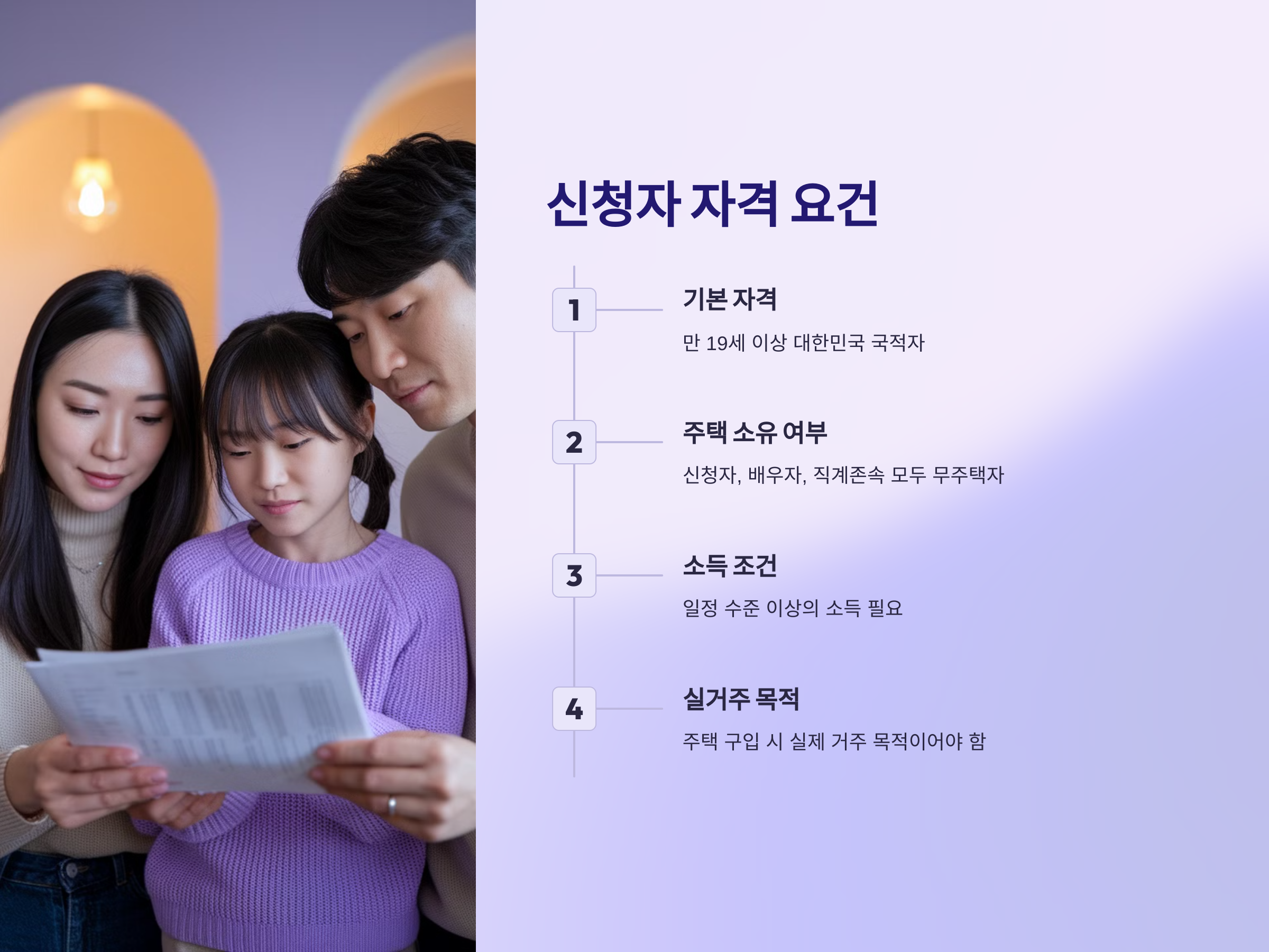 보금자리론을 신청하려면 일정한 자격 조건을 만족해야 합니다. 우선, 신청자는 대한민국 국적을 가진 만 19세 이상의 성인이어야 합니다. 그리고 신청자 본인과 배우자, 직계존속이 모두 "무주택자"여야 합니다. 즉, 신청자가 주택을 보유한 경우에는 보금자리론을 신청할 수 없으며, 이는 대출을 제공하는 목적에 맞지 않기 때문입니다.