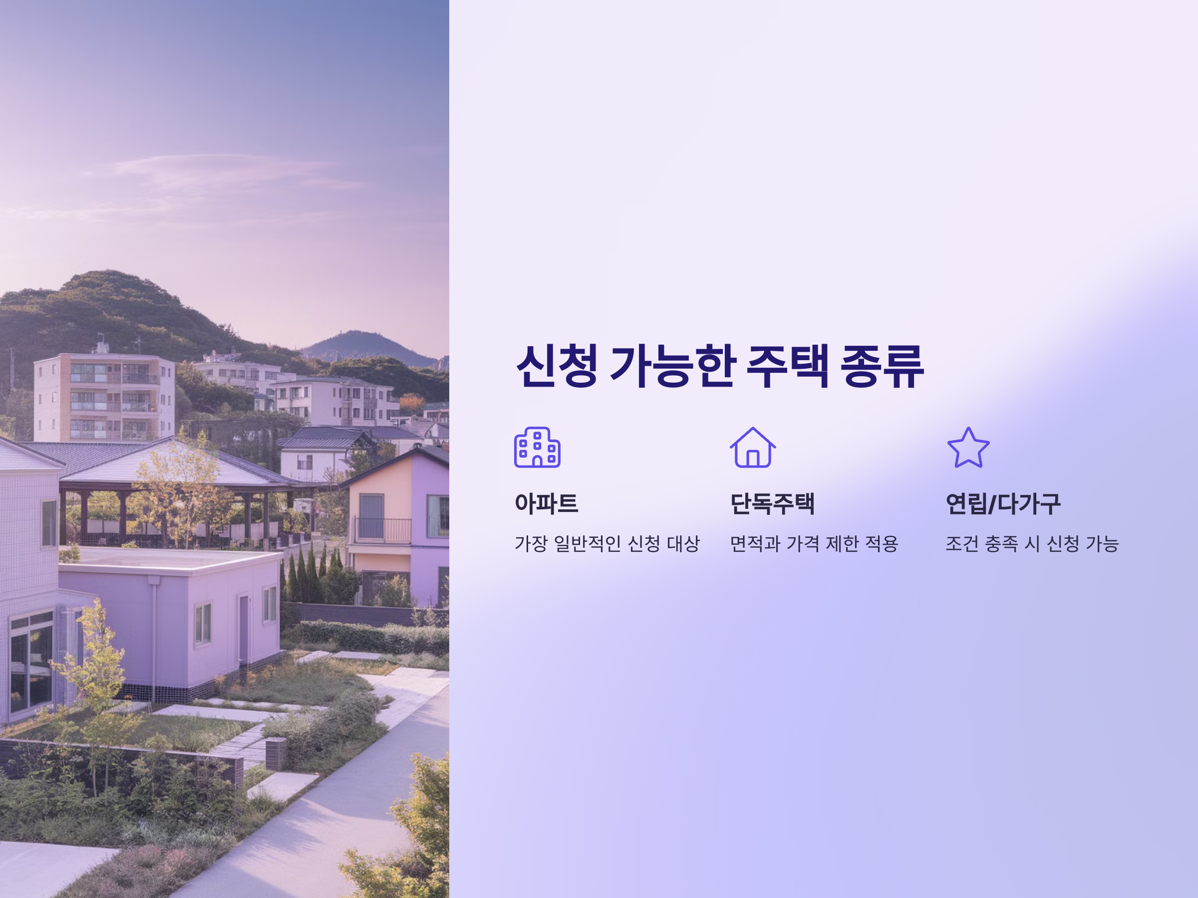 보금자리론 신청 가능한 주택의 종류는 다양합니다. 가장 일반적으로 신청할 수 있는 주택은 아파트입니다. 하지만 아파트뿐만 아니라 단독주택, 연립주택, 다가구 주택 등도 보금자리론의 신청 대상에 포함됩니다. 이때 중요한 점은 주택의 면적과 가격이 해당 대출 상품의 조건을 충족하는지 확인하는 것입니다.