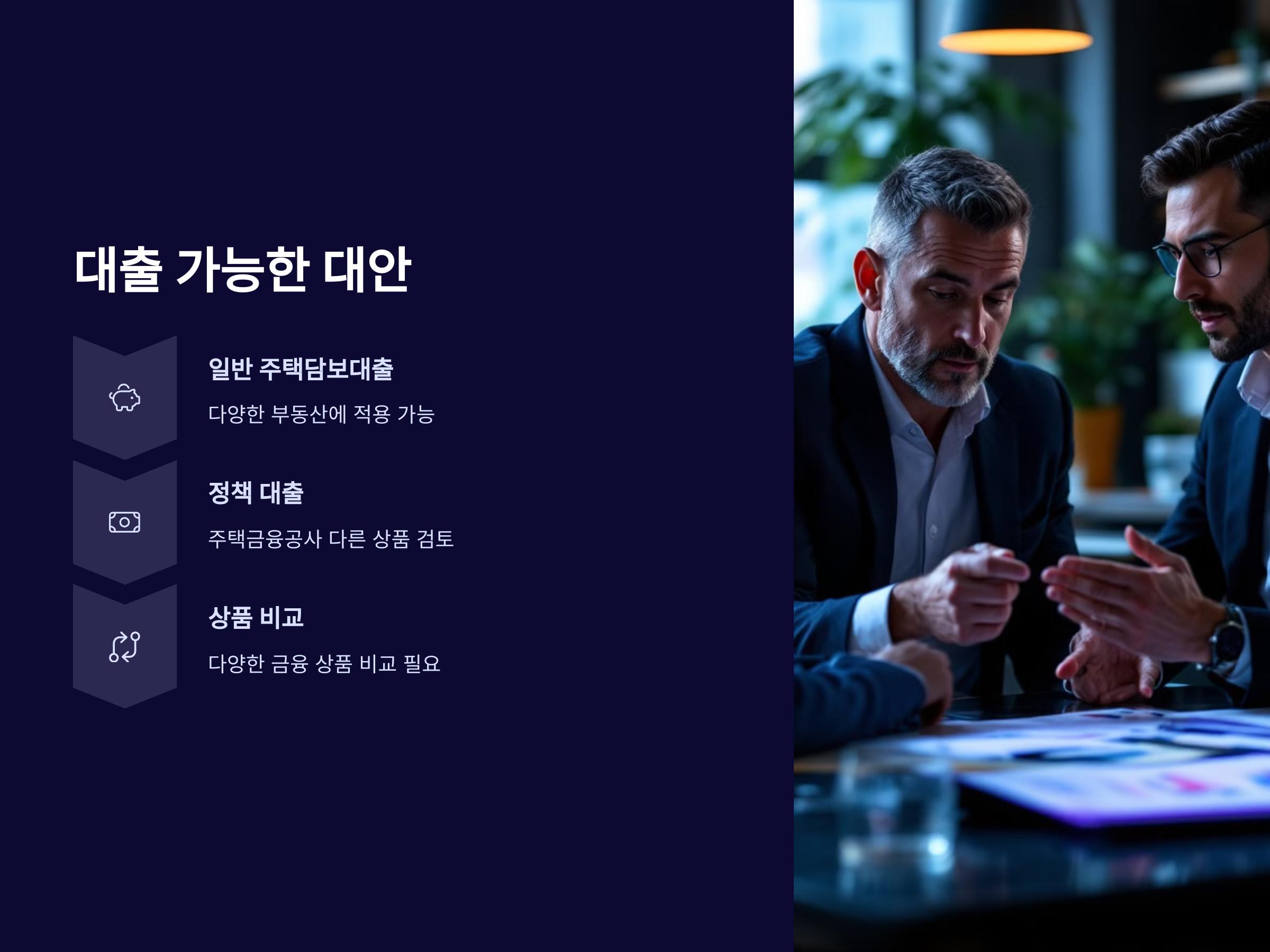 또한, 주택금융공사에서 제공하는 다른 대출 상품도 검토할 수 있습니다. 예를 들어, 내 집 마련을 위한 다양한 정책 대출이 있을 수 있으므로, 해당 상품들을 비교해보는 것이 유리할 수 있습니다.