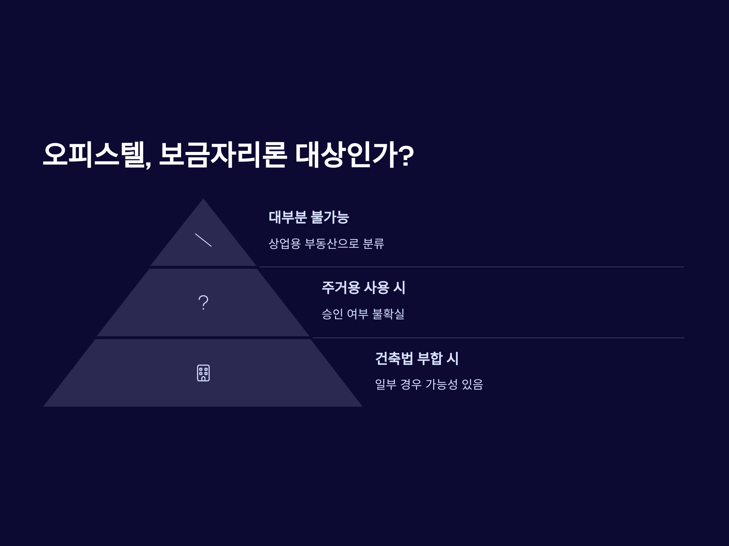 보금자리론을 이용할 수 있는 대상은 주택으로 간주되는 건물이어야 합니다. 대부분의 오피스텔은 상업용 부동산으로 분류되므로, 주택금융공사의 규정에 따르면 보금자리론을 이용할 수 없습니다. 오피스텔이 주거용으로 사용될 경우에도, 그 구조나 목적이 주택과 다르기 때문에 대출 승인 여부가 불확실합니다.