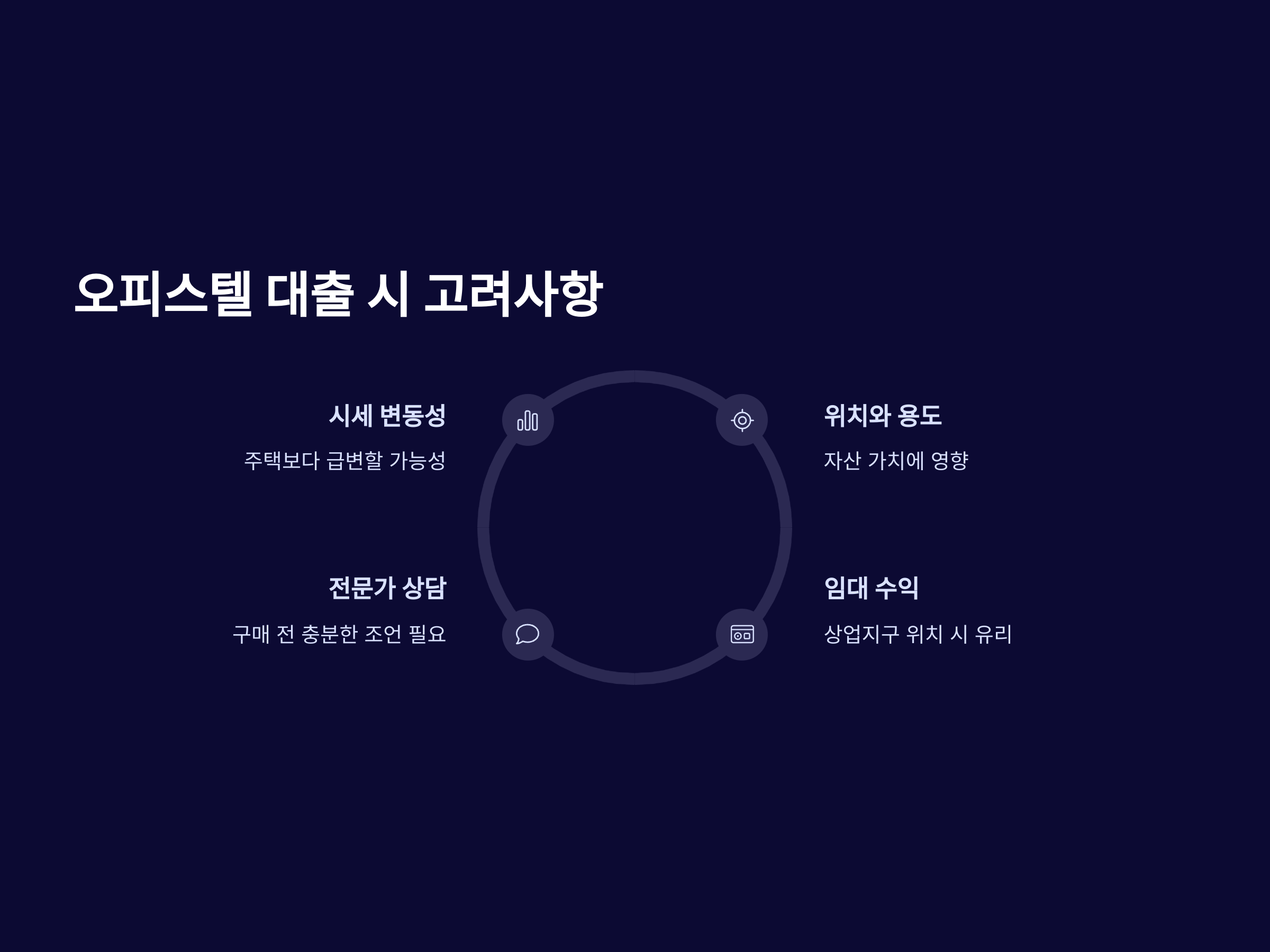 오피스텔을 구매하려는 경우, 대출 조건 외에도 몇 가지 중요한 요소를 고려해야 합니다. 첫째, 오피스텔은 주택과 다르게 시세 변동성이 큰 편입니다. 상업용 부동산이기 때문에, 주택보다 시세가 급변할 수 있으며, 이는 대출 상환에 영향을 미칠 수 있습니다.