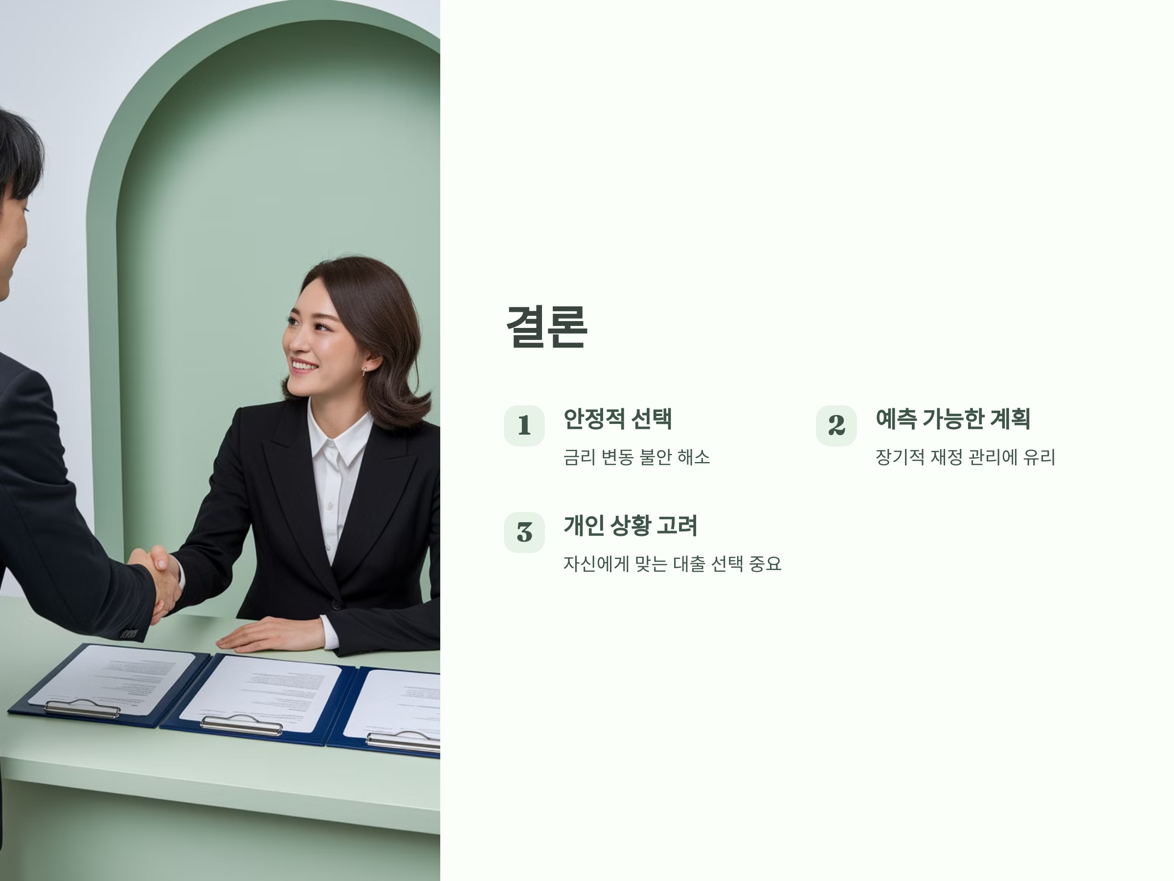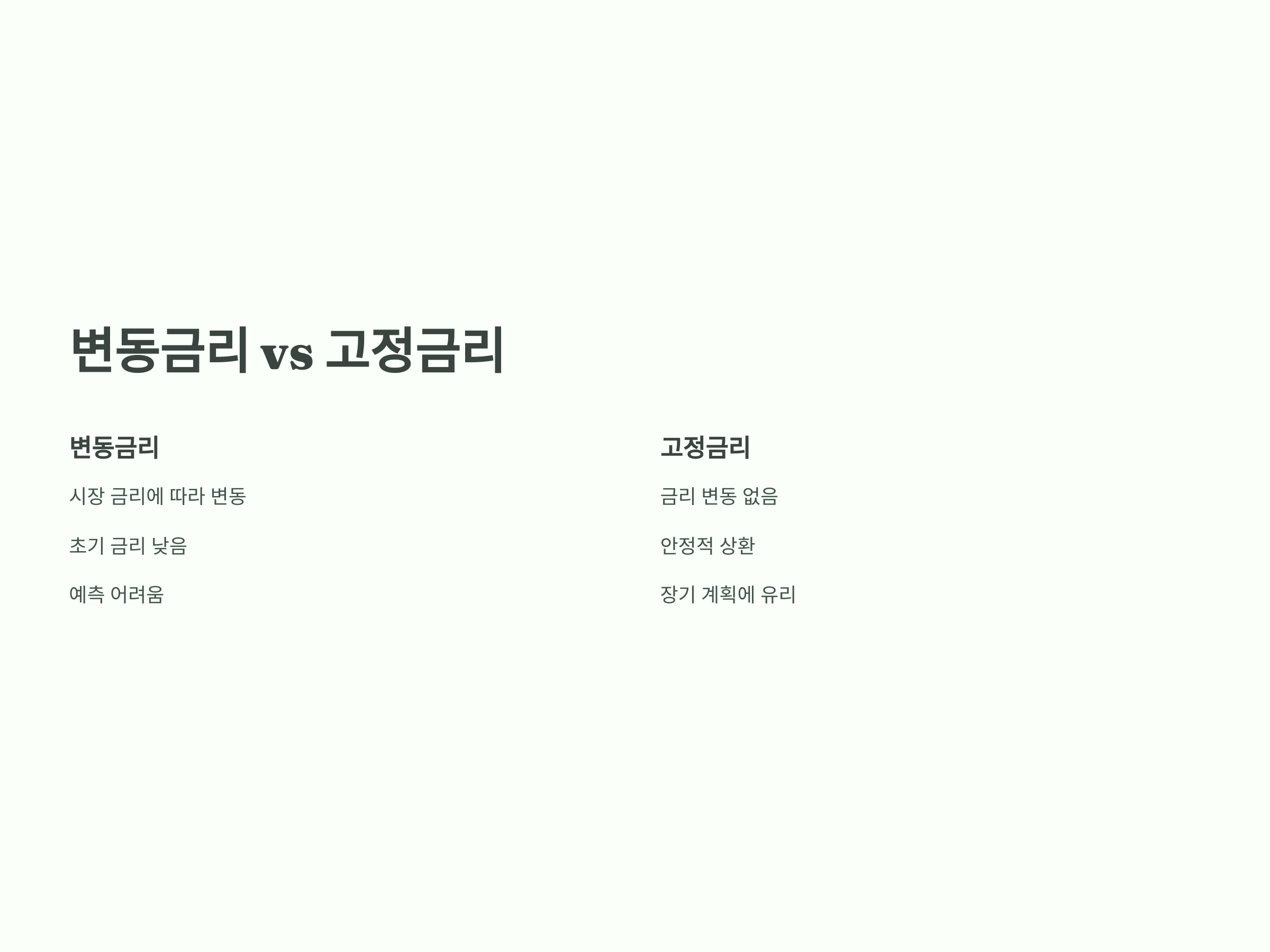 A: 금리가 상승할 것으로 예상되거나 장기적으로 안정적인 대출 상환을 원한다면 고정금리가 유리할 수 있습니다. 반면, 금리가 낮을 것으로 예상되면 변동금리를 선택할 수도 있습니다.