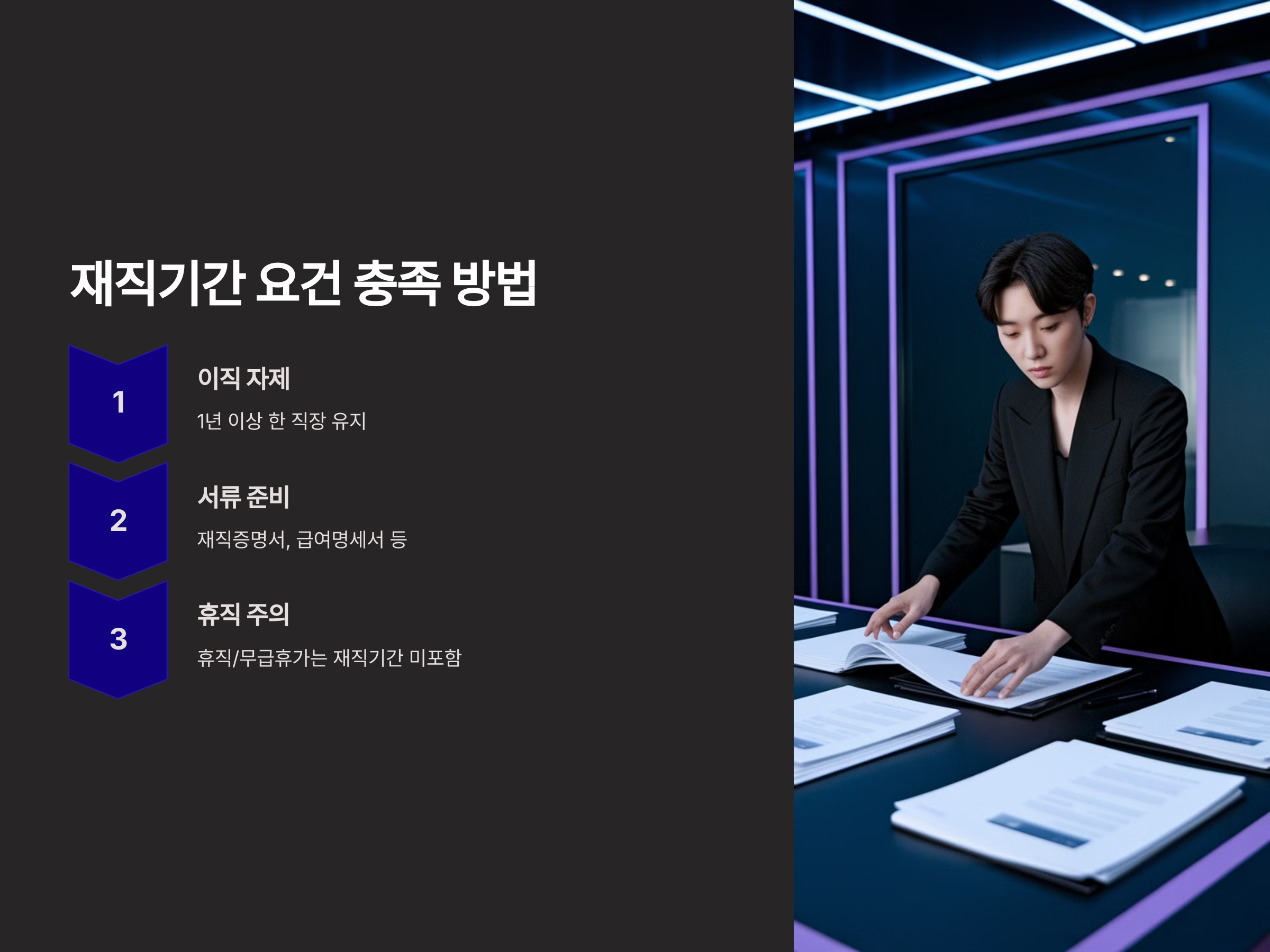 휴직이나 무급휴가 기간은 재직기간에 포함되지 않습니다. 따라서 휴직 상태라면 재직기간을 충족하지 못할 수 있습니다. 이 부분도 미리 확인하고 준비해야 합니다.