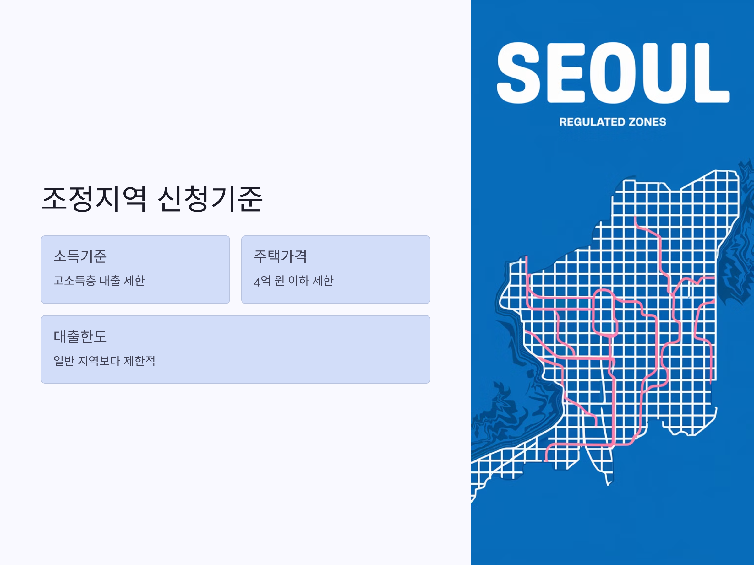 - 소득기준: 조정지역에 거주하는 사람은 일정 소득 이상일 경우 대출이 제한될 수 있습니다. 특히, 고소득층은 대출이 어려울 수 있습니다.