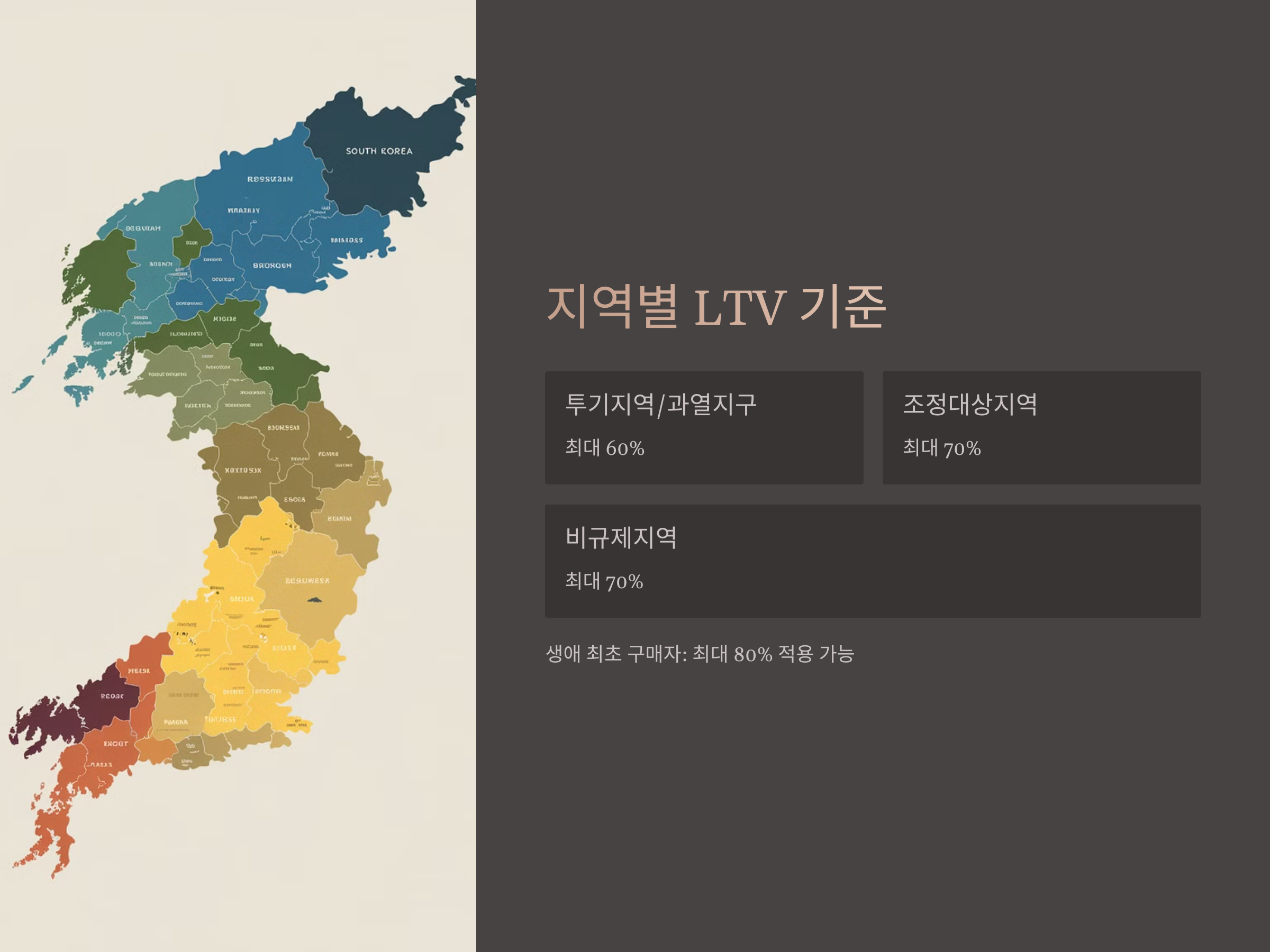 주택담보인정비율(LTV)은 지역에 따라 다르게 적용됩니다: