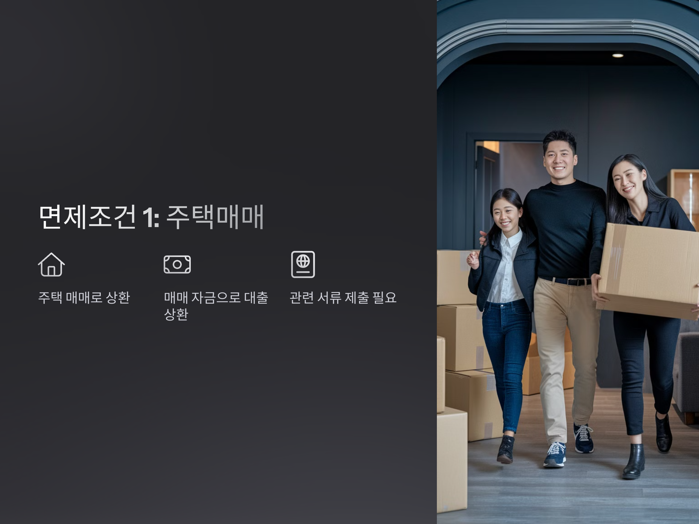 보금자리론에서 중도상환위약금을 면제받기 위한 조건은 크게 2가지로 나눌 수 있습니다.