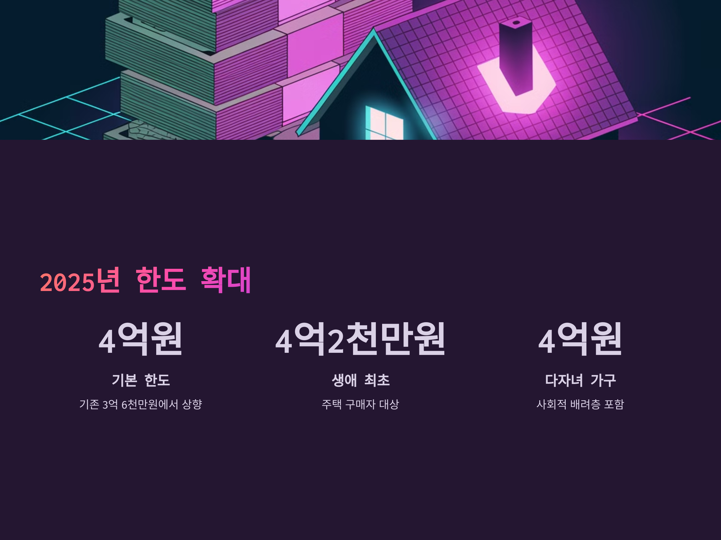 2025년 보금자리론의 한도는 기존의 3억 6천만 원에서 최대 4억 원까지 확대되었습니다. 이 확대된 한도는 특히 다자녀 가구나 생애 최초 주택을 구매하려는 사람들에게 유리합니다. 다자녀 가구의 경우, 최대 대출 한도가 4억 원으로 증가하며, 생애 최초 주택을 구매하는 경우에는 4억 2천만 원까지 가능합니다【10†source】【11†source】.