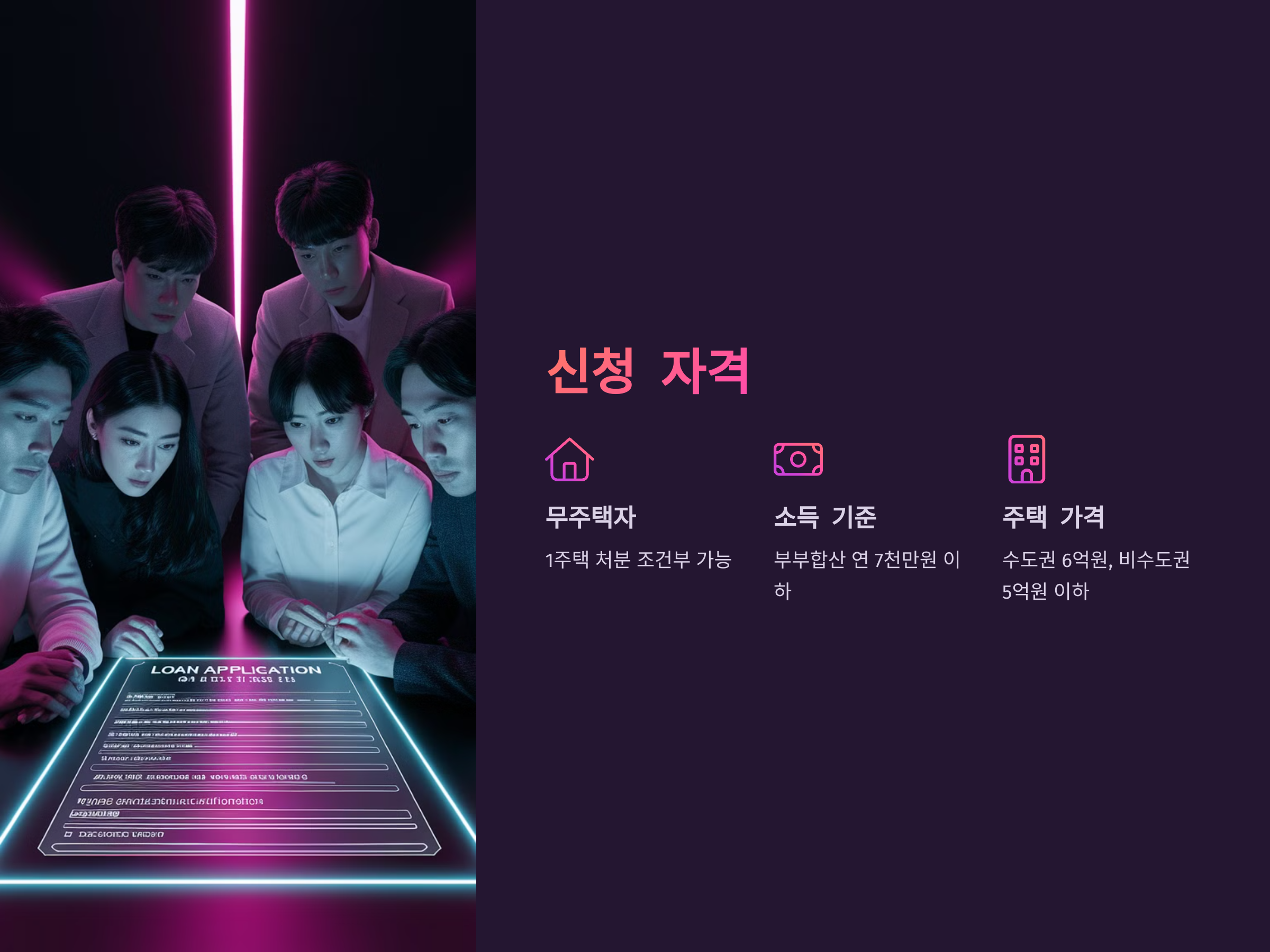 보금자리론을 신청하려면 일정 자격을 충족해야 합니다. 주요 조건은 다음과 같습니다: