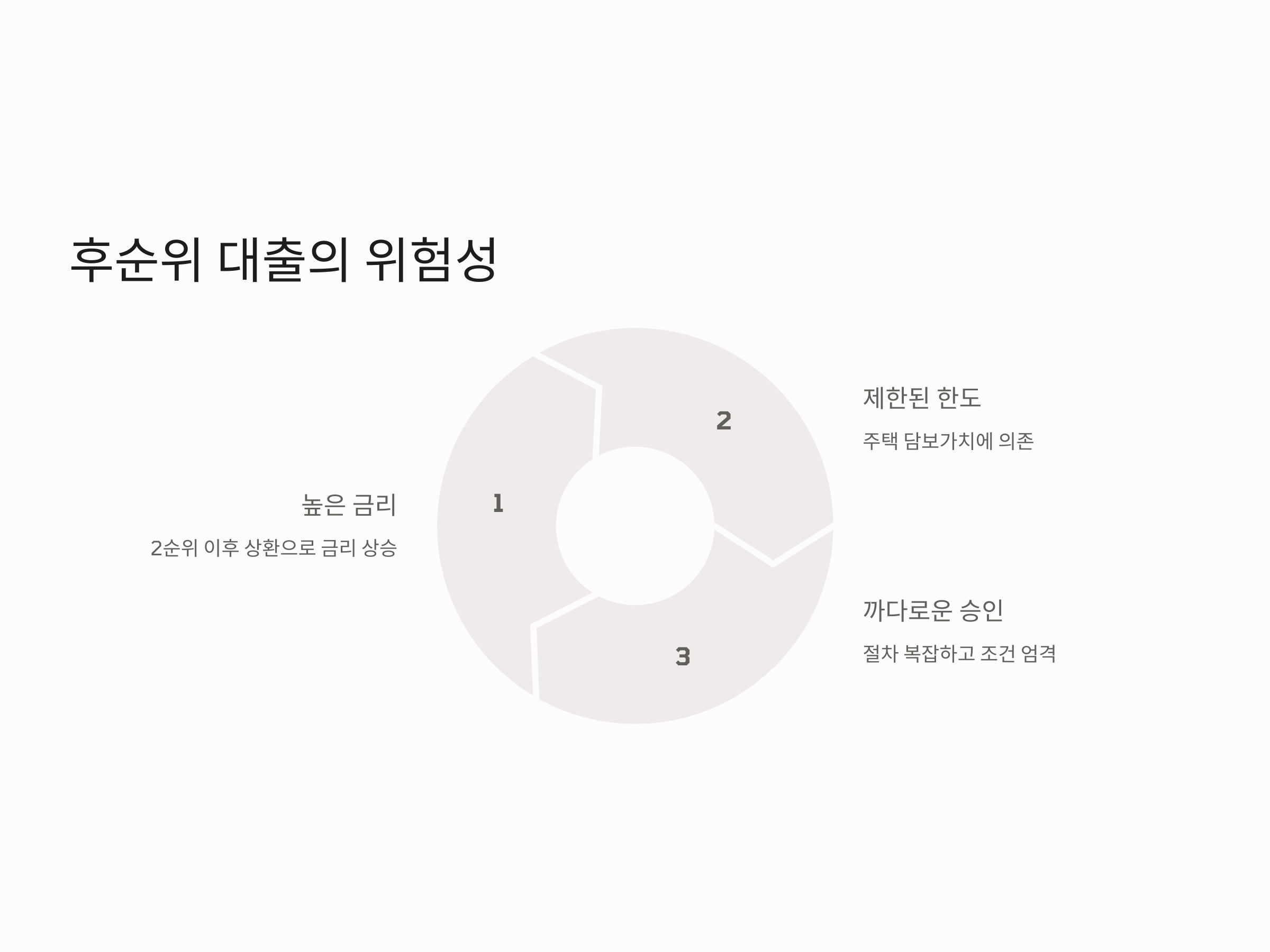 후순위 대출의 가장 큰 특징은 바로 금리가 높다는 것입니다. 일반적으로 보금자리론과 같은 1순위 대출의 금리가 낮은 반면, 후순위 대출은 2순위 이후로 상환이 이루어지기 때문에 금리가 높은 경우가 많습니다. 또한, 후순위 대출의 경우 대출 한도가 작거나, 대출 승인 절차가 까다로울 수 있습니다.