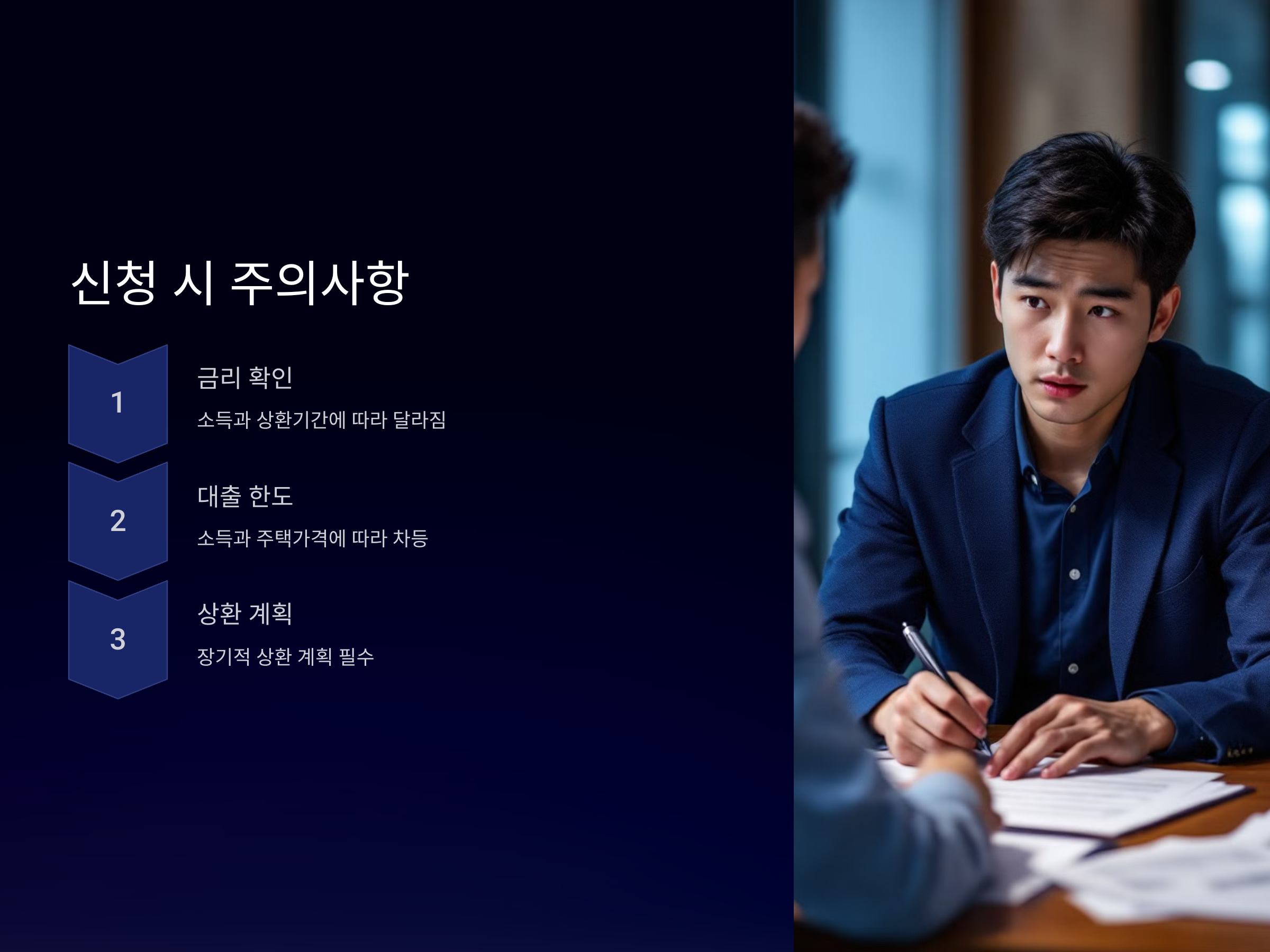 - 소득 조건: 소득 수준에 따라 대출 한도가 달라집니다. 보통 연 소득이 낮을수록 더 높은 한도를 받을 수 있습니다. 이 외에도 주택 가격과 거주 지역에 따라 대출 한도가 달라질 수 있으므로, 자세한 조건은 본인의 상황에 맞게 확인하는 것이 중요합니다.